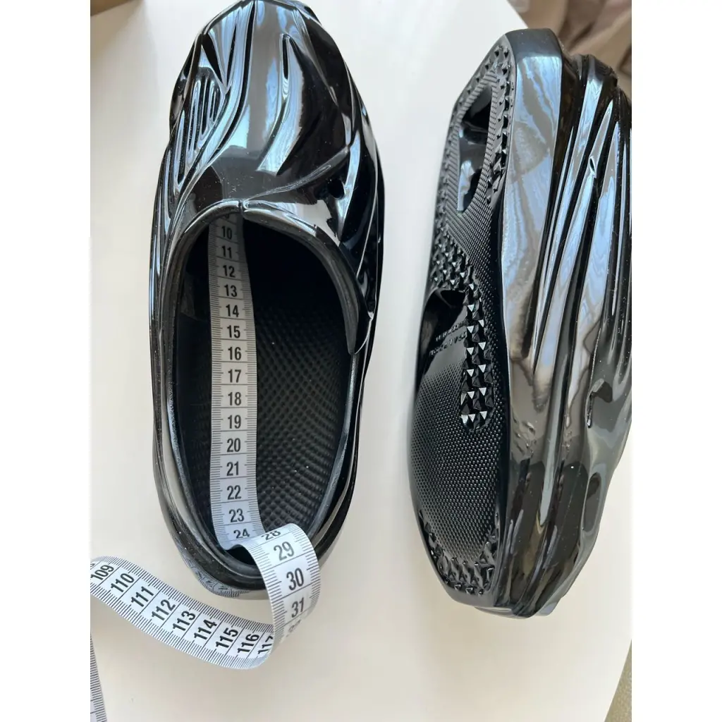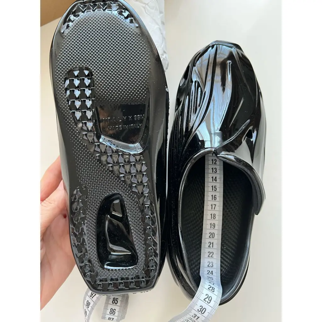 Low-top glossy molded rubber slip-on sneakers in black featuring cutout detailing throughout. Supplier color: Black Brand Color