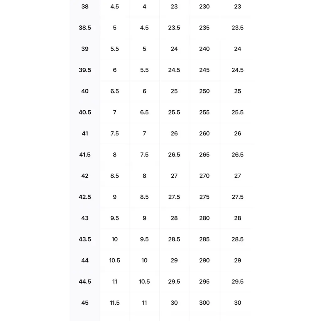 EU 38 39 39,5 40 40,5 41 41,5 42 42,5 43 43,5 44 44,5 45 45,5 46 46,5 47 47,5 48 48,5 49 50 Таблица размеров