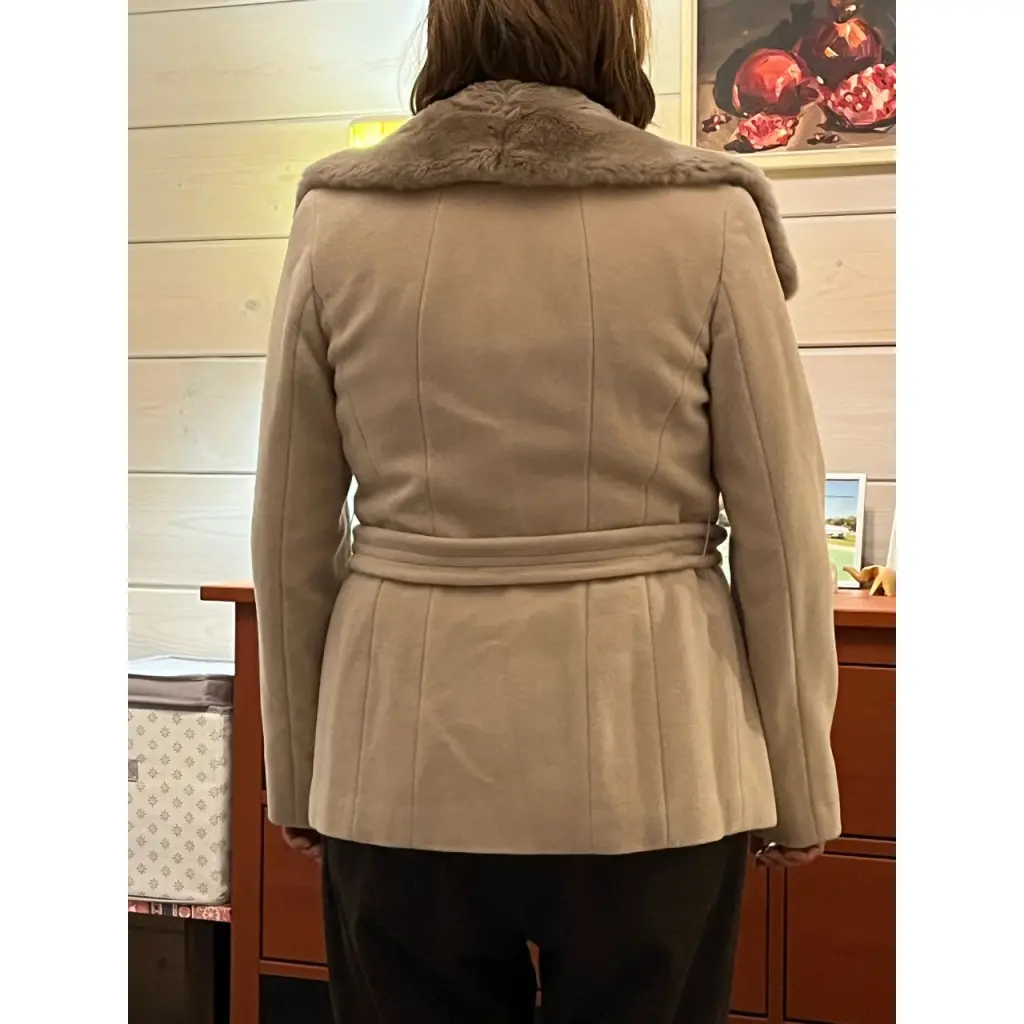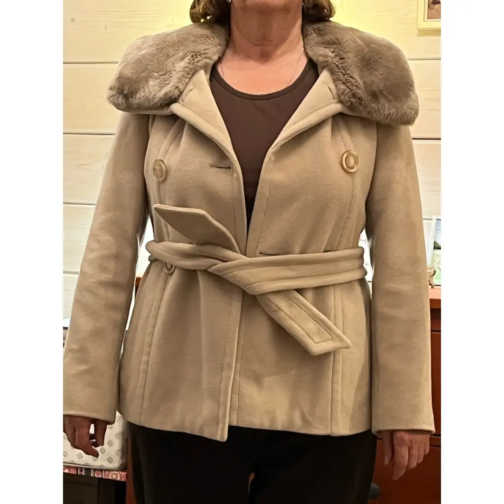 Пальто черная шесть размер FR 40, отрезное по талии, супатная застёжка на металлические пуговицы с поясом на металлической пряжке, на рукавах ремешки с пряжками. Под воротником крючок для плотного застёгивания. На клапанах карманов пуговицы. Пальто теплое и комфортное для осени и весны.