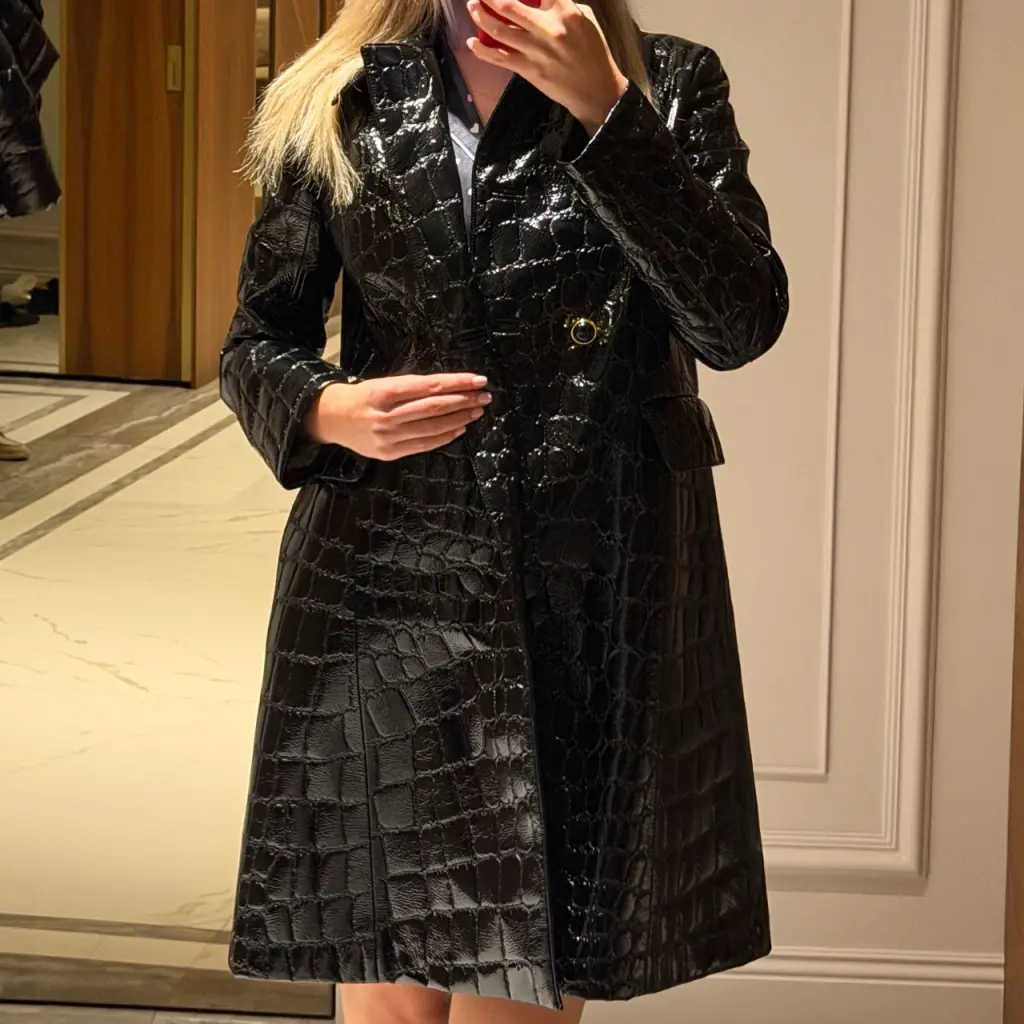 Роскошное пальто из искусственной кожи с тиснением под крокодила.