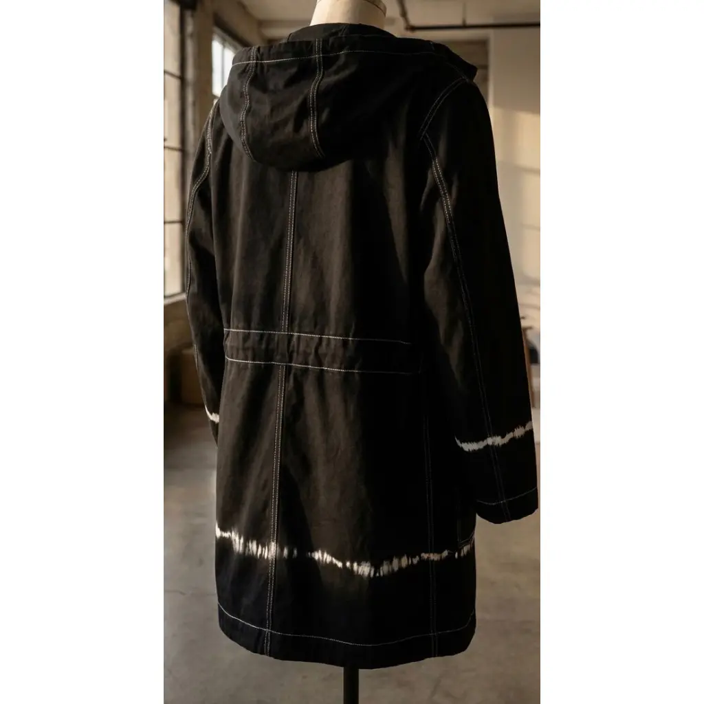 парка в исполнении Франческо Риссо получилась графичной. Структурированный вид модели из мягкого плотного денима придают строчки, прошитые белой нитью, а выполненные в технике тай-дай полосы на рукавах и низе делают ее уникальной.