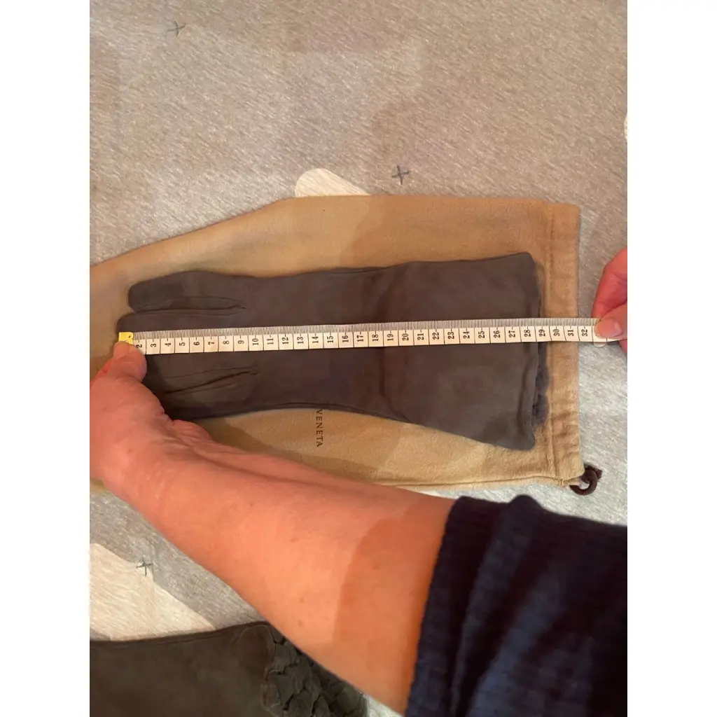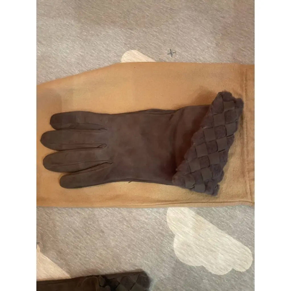 Женские замшевые утепленные перчатки Bottega Venetia. Удлиненная модель с отворотом отдельным характерным плетением с мехом. Состояние отличное. Не носились. Куплены в бутике марки в Италии. Есть пыльник