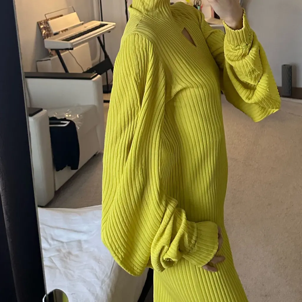Яркий лимонный оттенок, эластичный рубчатый трикотаж, характерные для бренда объёмные рукава, акцент на талии и пикантный вырез в зоне декольте.