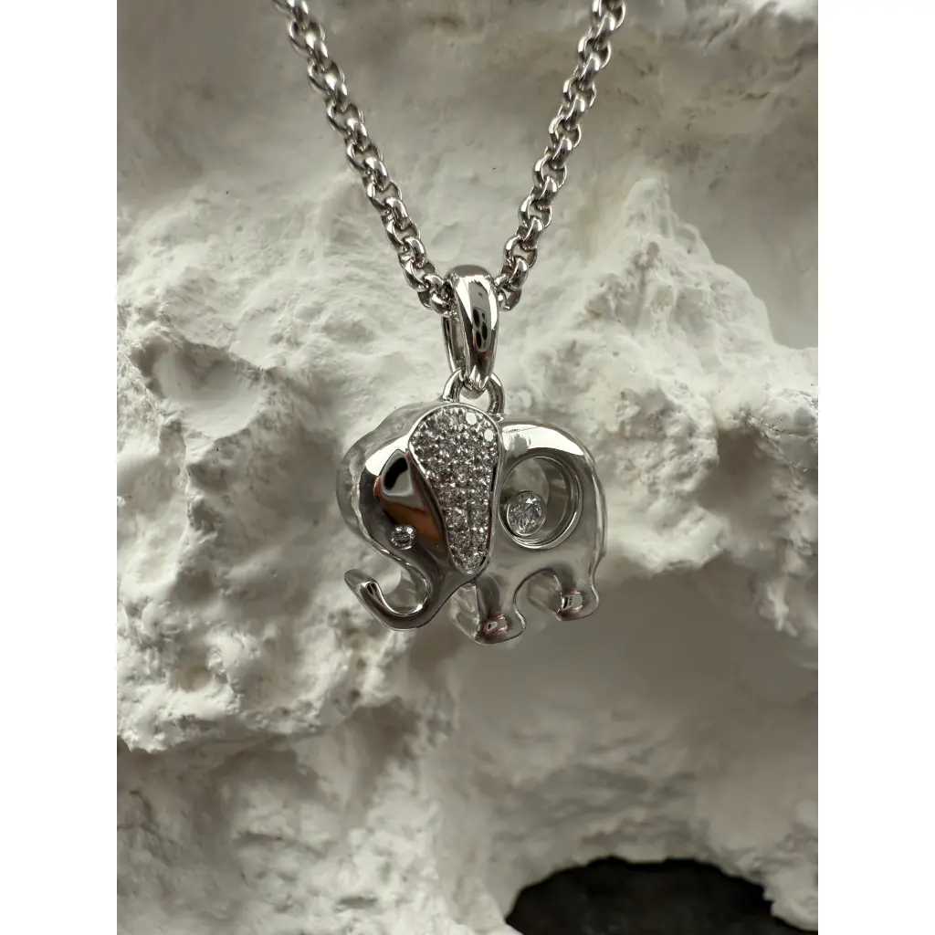 Подвеска - кулон Chopard коллекции "Happy Diamonds Elephant" выполненный из белого золота 750 пробы с бриллиантами. 17 бриллиантов классической формы огранки общей массой 0,10 ct. 1 плавающий бриллиант общей массой 0,05 ct. Длина цепочки - 42 см. Вес - 15,05 гр. В комплекте коробка. В наличии в Москве. Быстрая передача курьеру.