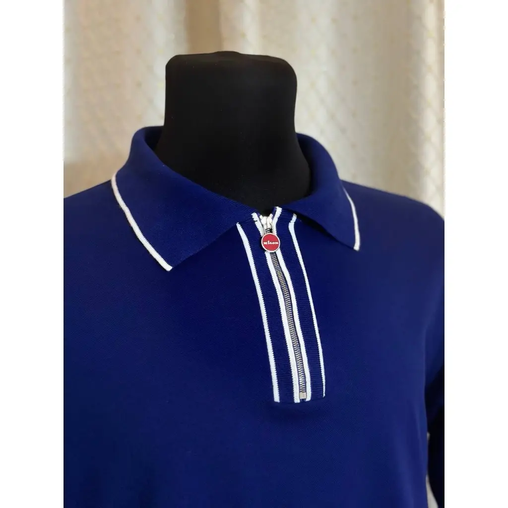 В весенне-летнюю коллекцию вошло прямое поло оттенка синий электрик. Полосатый узор подчеркивает отложной воротник, планку с молнией и манжеты коротких рукавов. Для пошива модели мастера марки использовали мягкий хлопковый трикотаж, который хорошо пропускает воздух и слегка тянется, поэтому изделие почти не ощущается на теле.