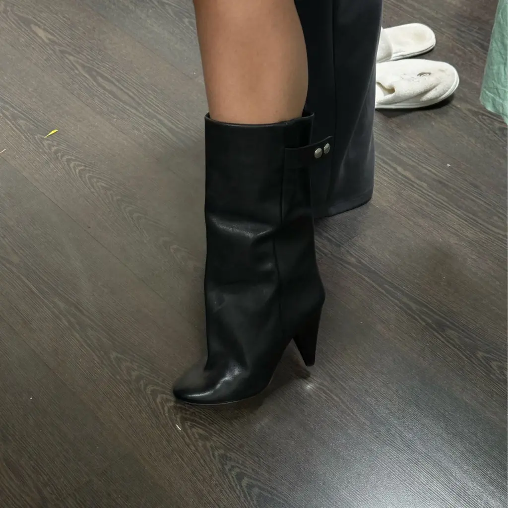 Кожаные ботильоны Isabel Marant надевала дважды. Состояние идеальное. Размер 39, но подойдут на 38,5. Несколько вариантов носки. Благодаря широкому голенищу удобно снимать и надевать, регулируя посадку с помощью ремешка с кнопками сзади.
