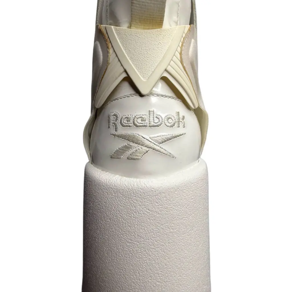 Модель дополнена аккуратной вышивкой логотипа Reebok на тыльной части и стильным брелоком, который подчеркивает коллекционный статус пары. Скульптурная подошва переосмысляет оригинальный прототип: спереди появляются более массивные элементы, а высокий каблук около 9 см в сочетании с платформой визуально вытягивает силуэт и придает шагу подиумную устойчивость.