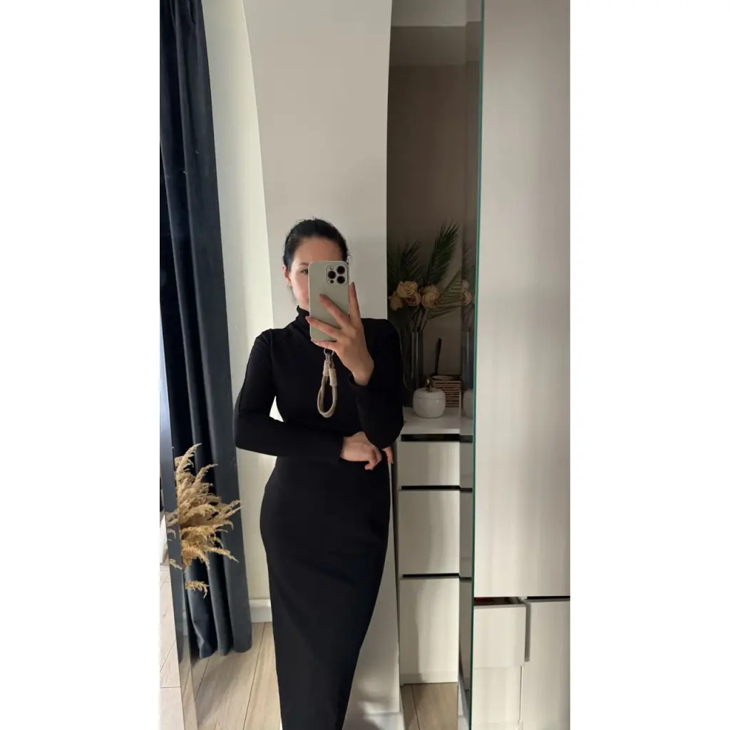 Длина макси, полуприлегающий силуэт с воротником стойкой. Материал достаточно плотный, держит форму, но лучше с бесшовным бельем.
