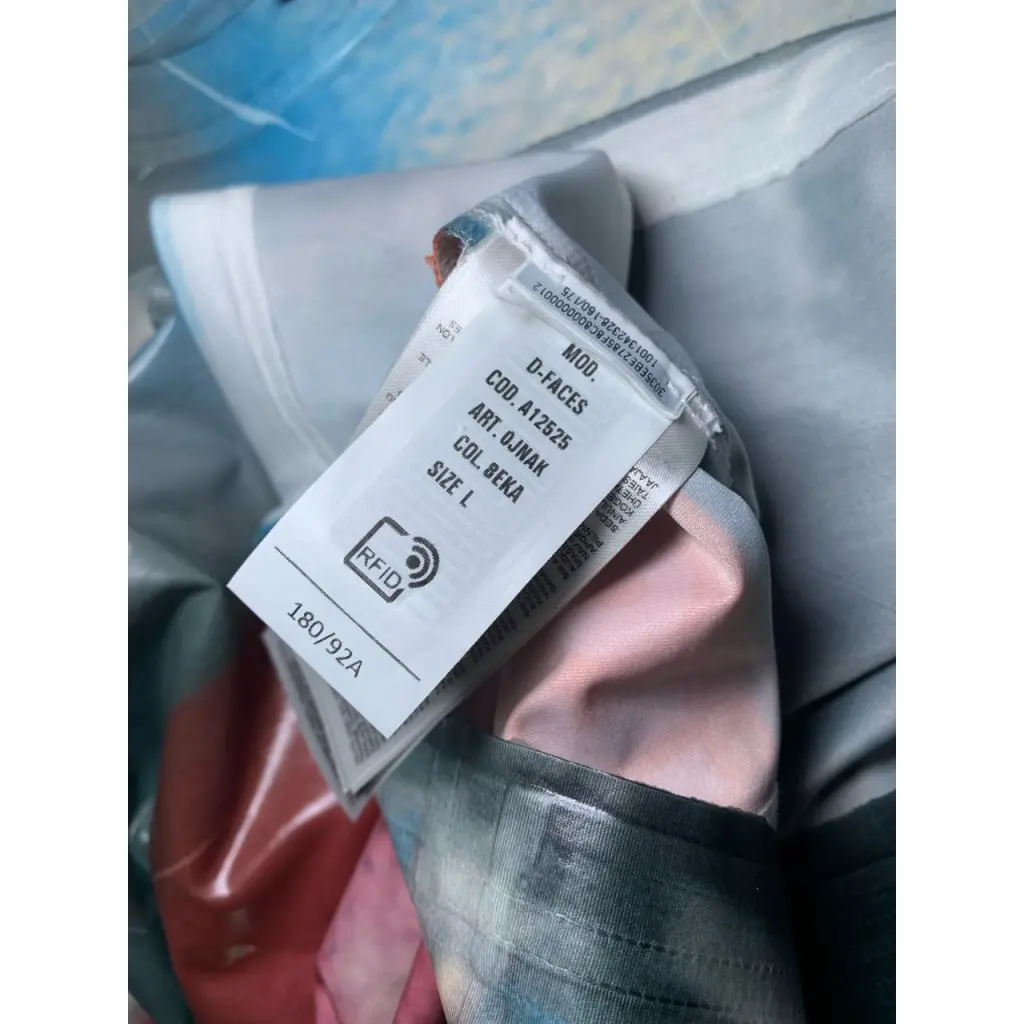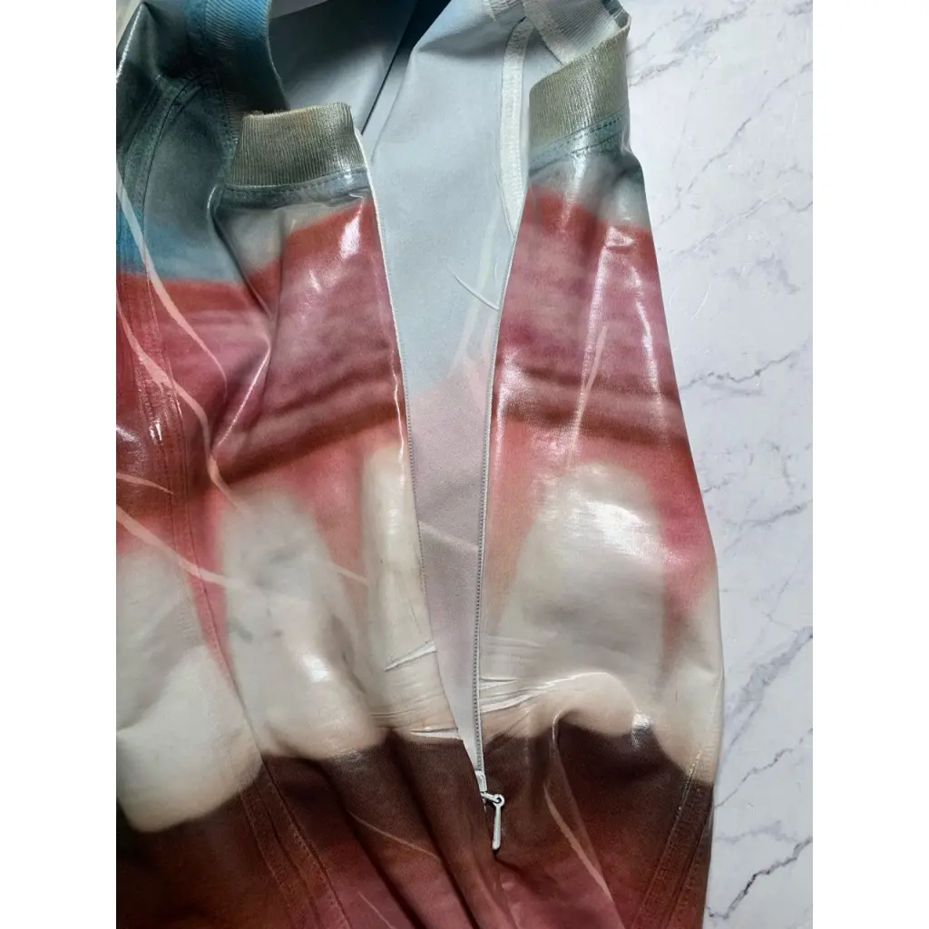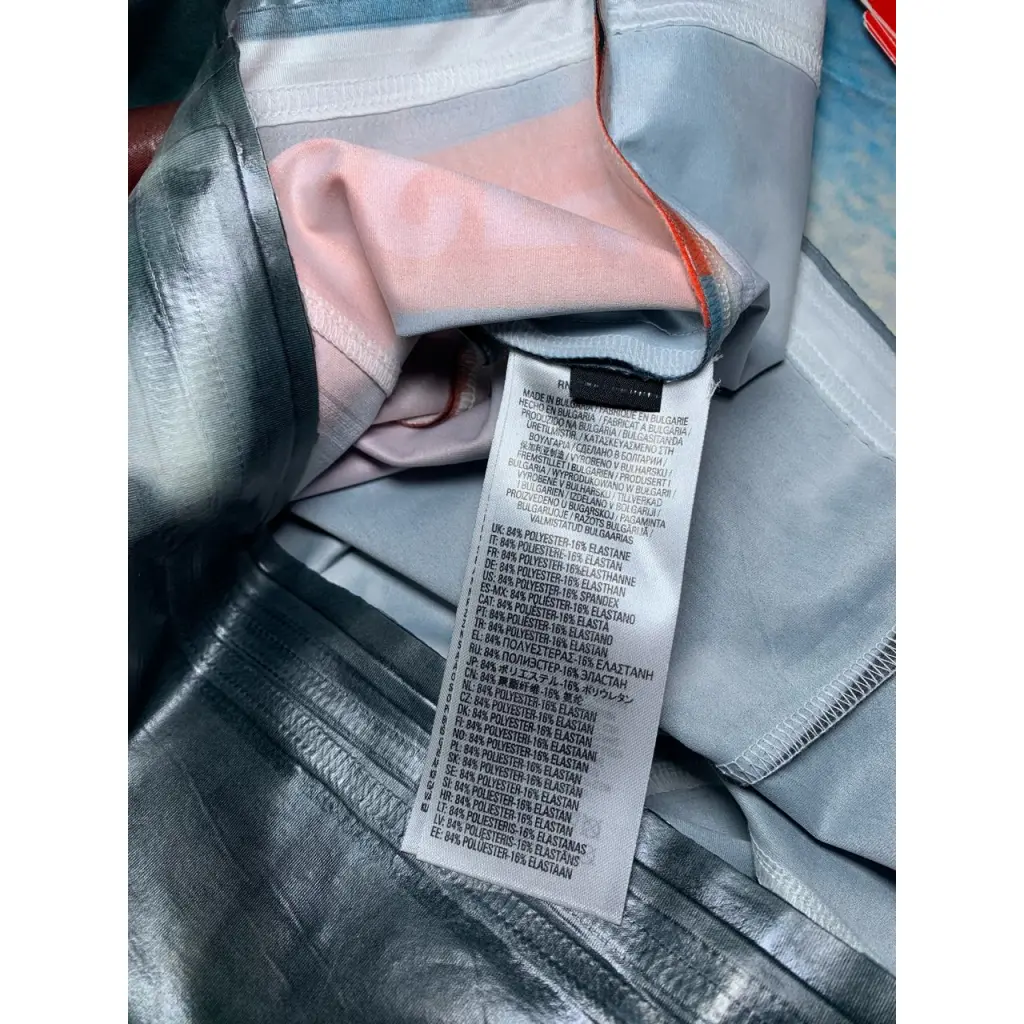 Часть осенне-зимнего показа подиумного шоу 2023 года, это женское синее мини-платье вырезано из эластичного трикотажа до приталенного кроя. Лицо крупным планом печатается с использованием инновационной техники сублимации, наносимой, когда одежда сложена, чтобы некоторые области оставляли пустыми.