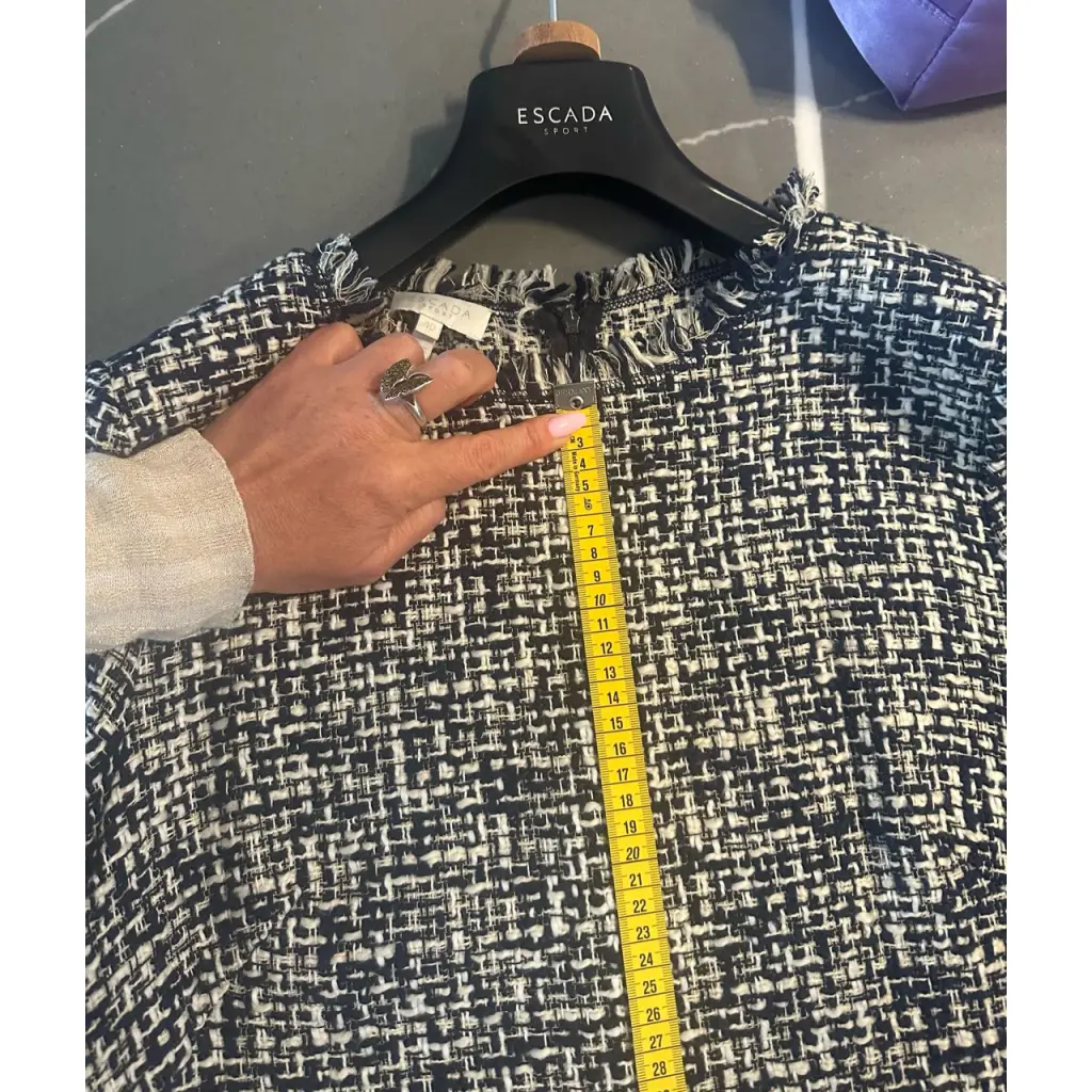 Темно-синие платье из мягкого хлопкового твида от ESCADA. -Прямой крой, короткие рукава, круглый вырез горловины, застежка-потайная молния на спинке. Бирки срезаны. Платье новое. Ни разу не одела, так и провисело в гардеробе