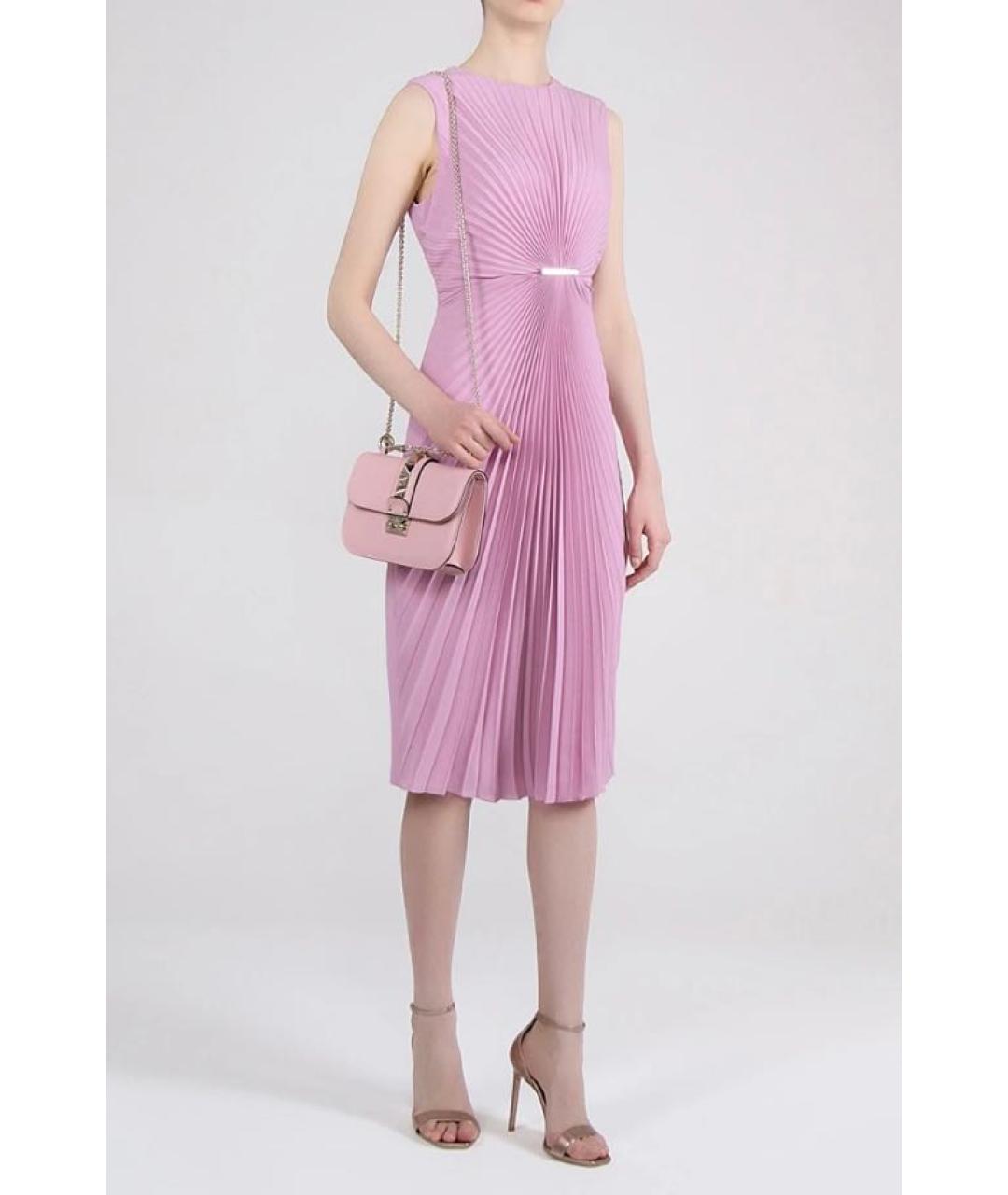 Шелковое миди платье от Salvatore Ferragamo. Модель выполнена в лиловом цвете с металлическим декором на талии. Круглый вырез горловины, плиссировка, приталенный силуэт, застежка - молния