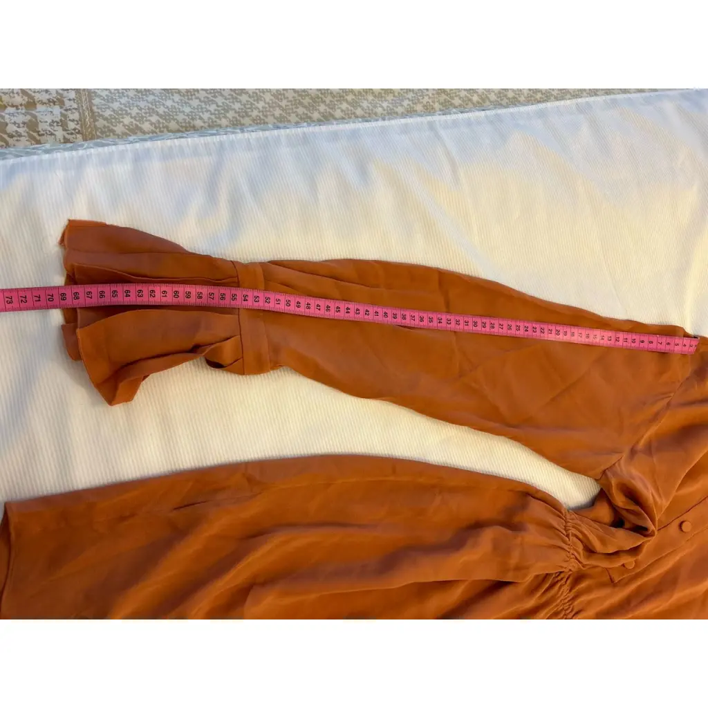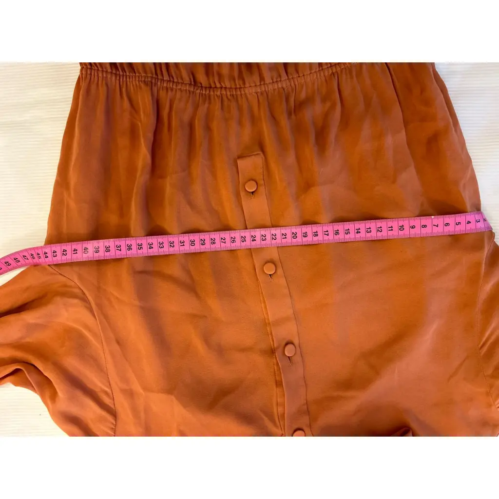 Платье из шелка с длинными рукавами очень легкое. Цвет темная пудра. На талии скрытая резинка ( можно носить как тунику) пуговицы, воротник в виде широкой ленты, которую можно завязать в бант или узел. Манжеты сделаны в виде складочек. Покупала в Италии. Надевала пару раз. Состояние отличное