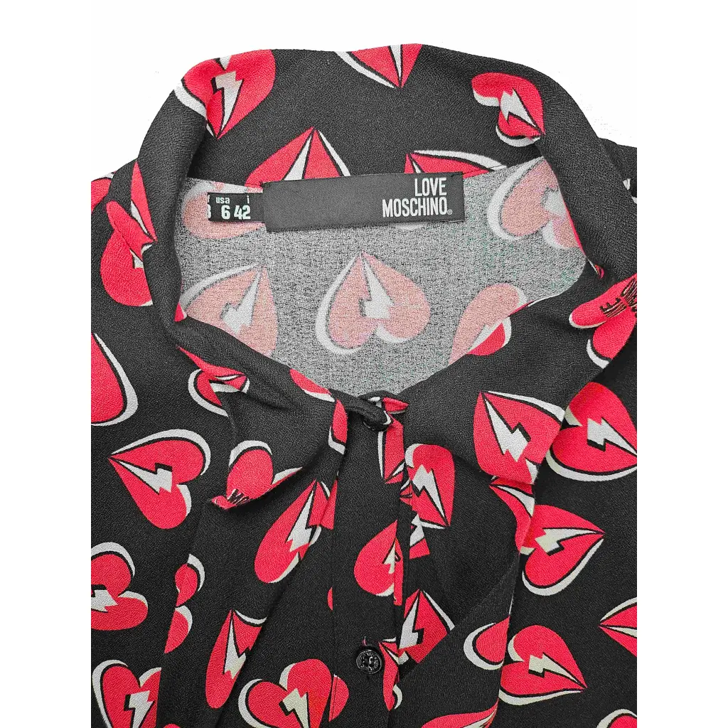 Эффектное платье Love Moschino с фирменным принтом в виде красных «сердец-молний» на чёрном фоне — модель, в которой невозможно остаться незамеченной. Лёгкая вискоза красиво струится, создаёт мягкий силуэт и комфортна в носке.