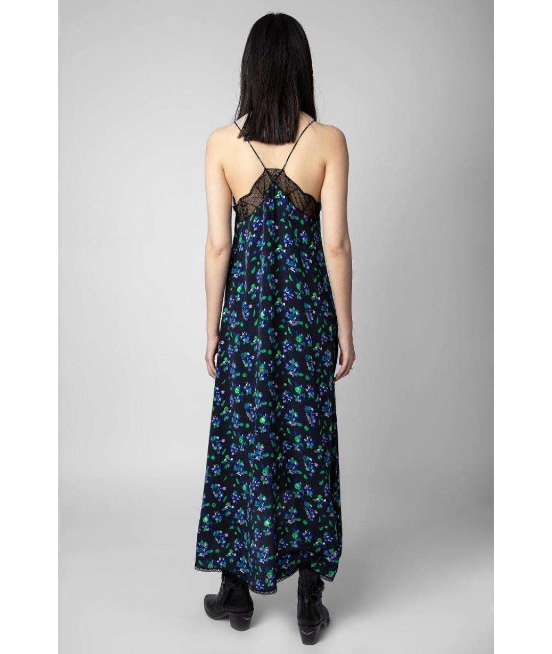 Zadig & Voltaire Risty dress noir Размеры в наличии: M, L Женское длинное платье из черного шелка Цветочный принт V-образный вырез, украшенный кружевом Бретели-спагетти Струящийся и асимметричный низ