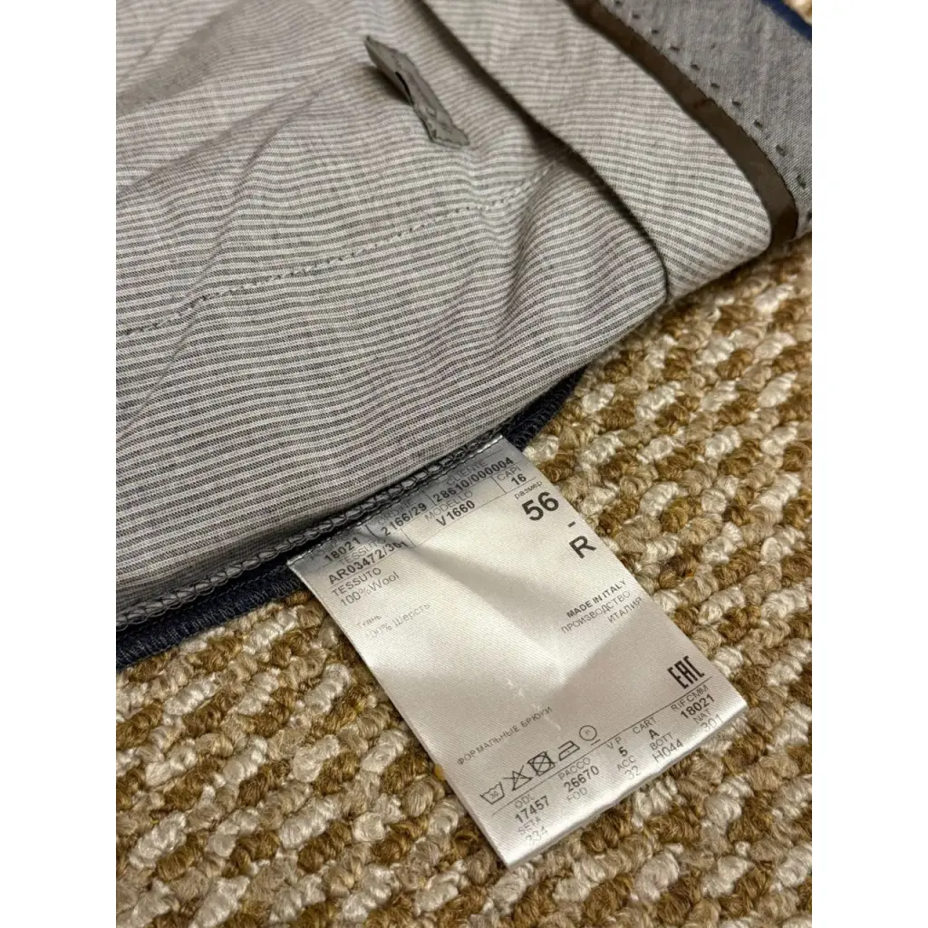 При создании синих карго команда марки использовала крой классических брюк. Такое впечатление формируют характерные карманы и пояс со шлевками для ремня. Для пошива модели дизайнеры бренда выбрали мягкую тонкую шерсть, которая не мнется и поддерживает оптимальную для тела температуру.