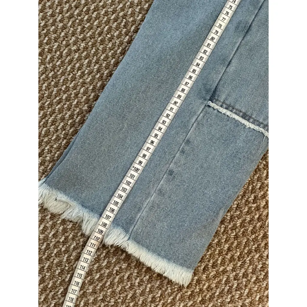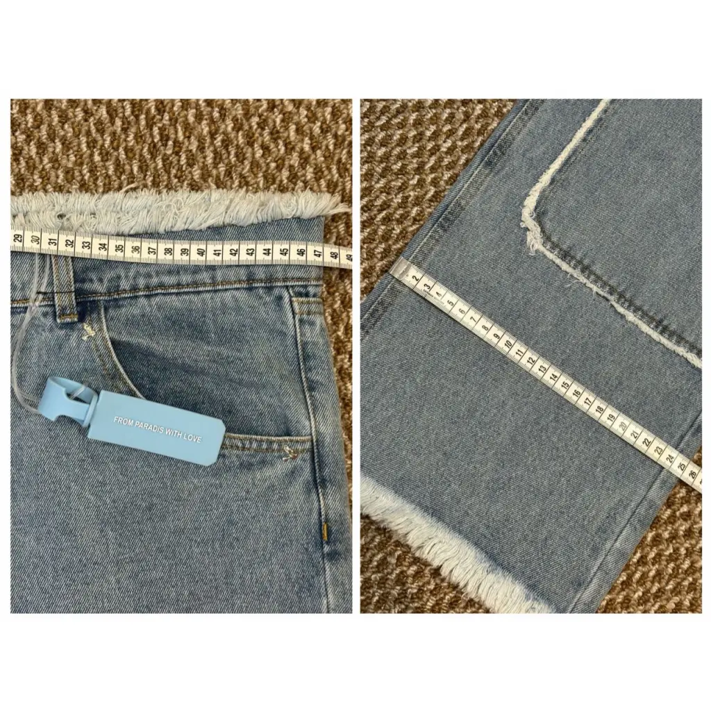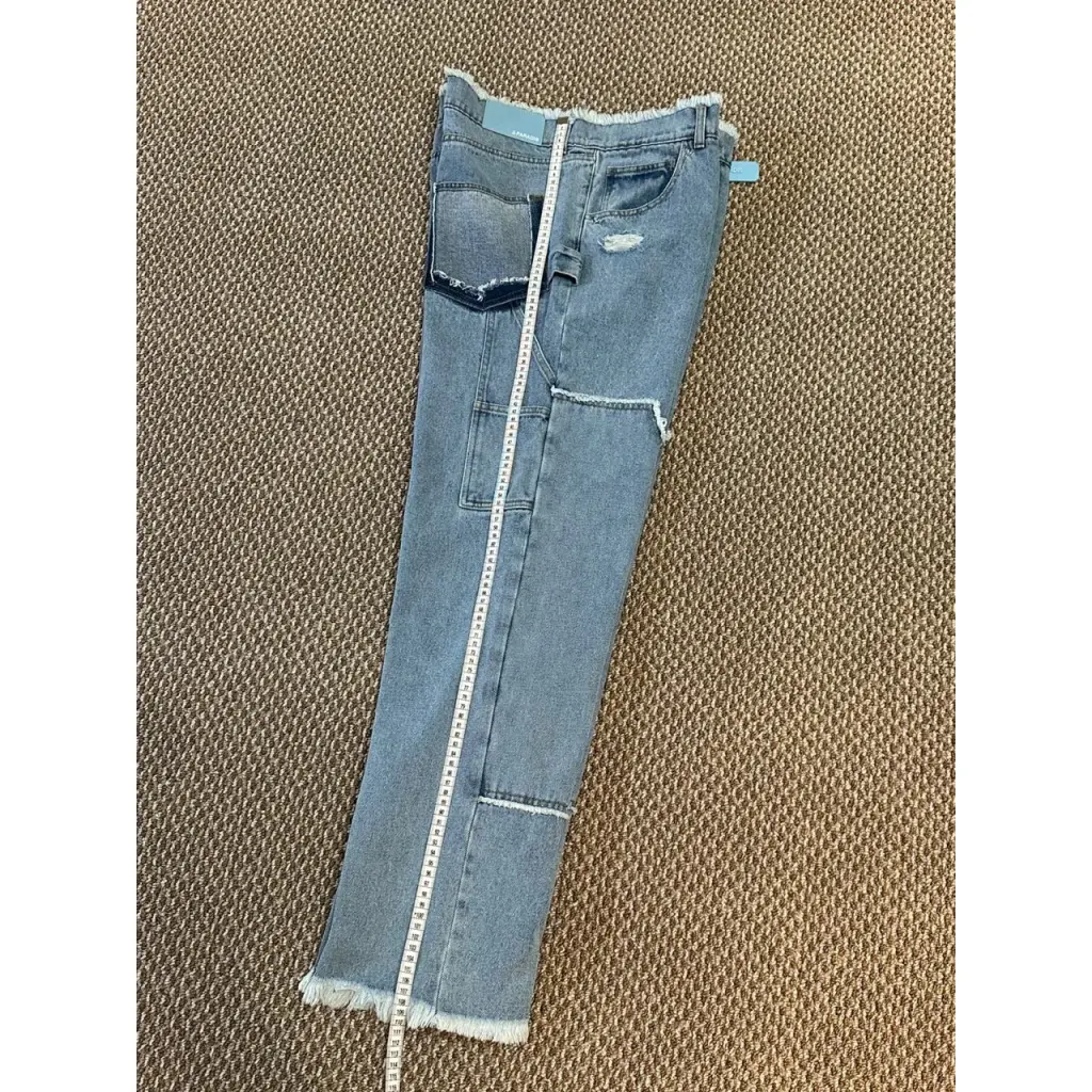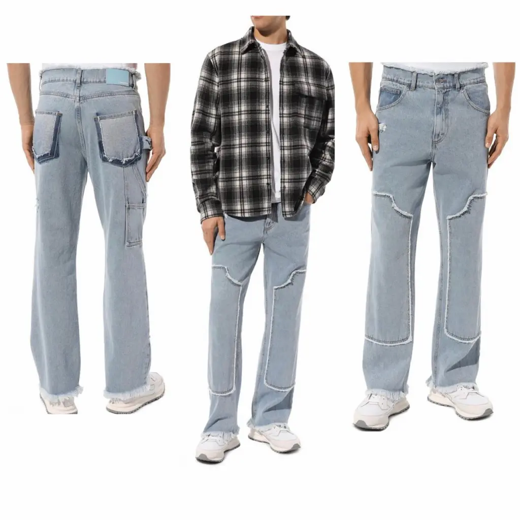 Джинсы из плотного хлопка ,бахрома на необработанных швах, панели на коленях, карманы . Роль декора в дизайне играют фирменные заклепки в виде голубя по краям передних карманов и брендированный патч сзади. Модель идеально впишется в расслабленный образ