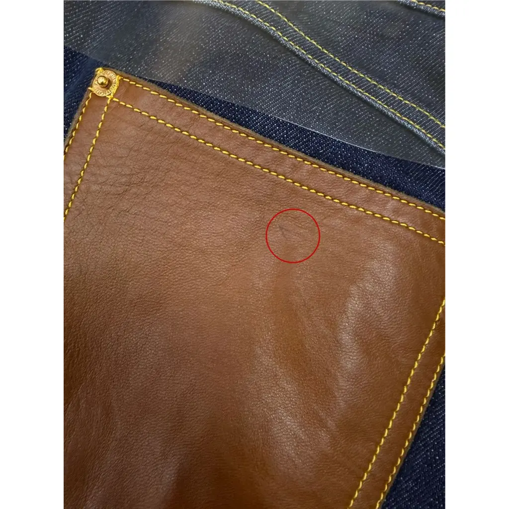Джинсы Louis Vuitton из денима с фирменными задними карманами, один из которых выполнен из кожи, а другой украшен монограммой.
