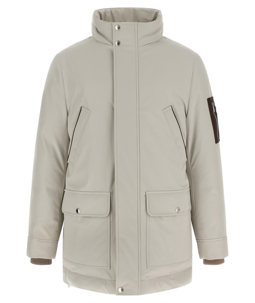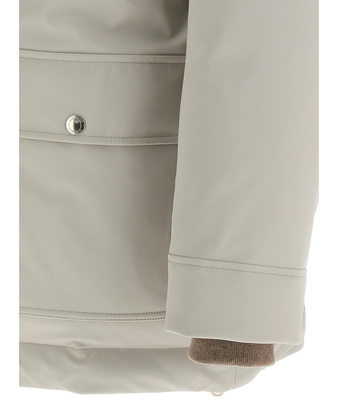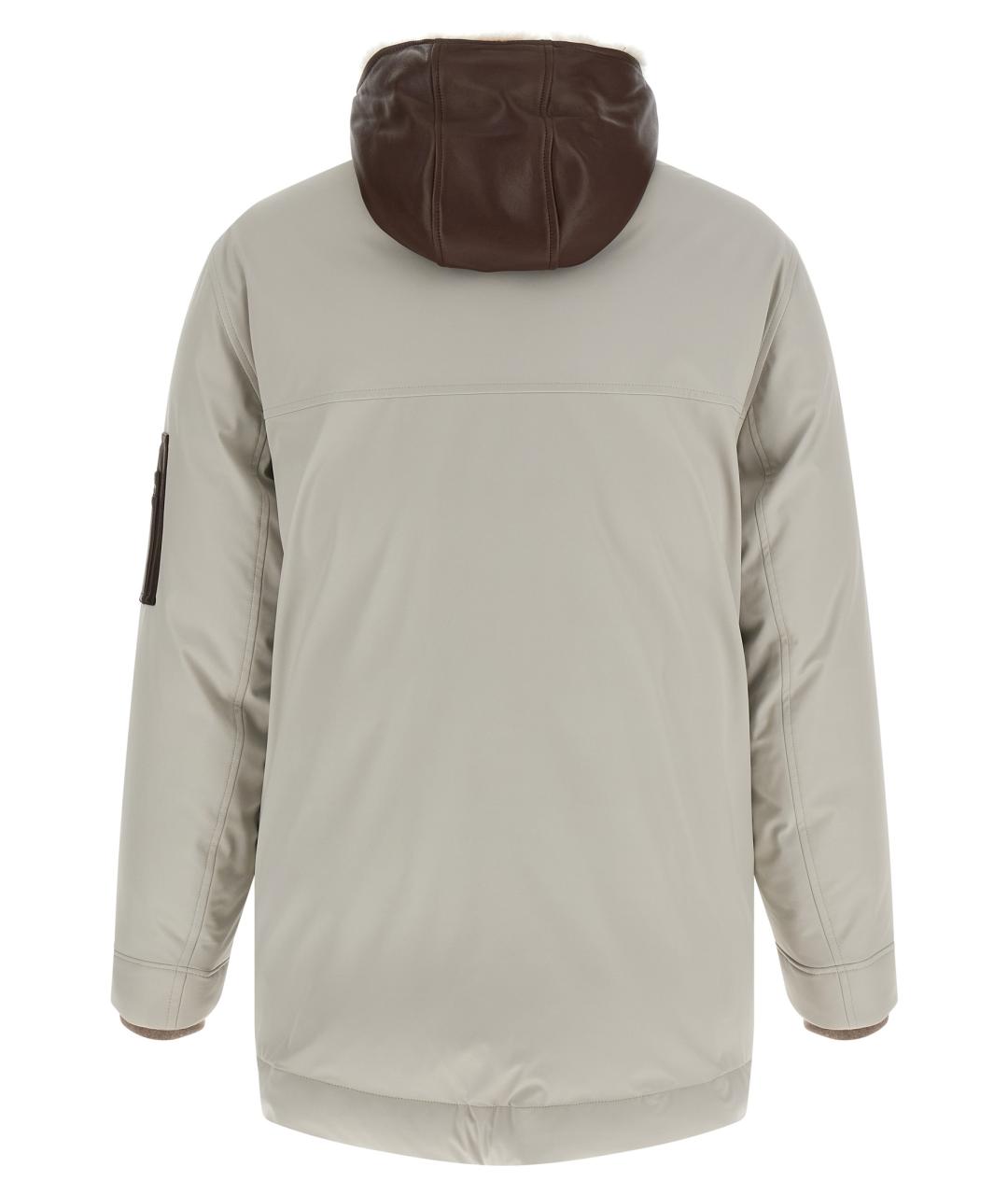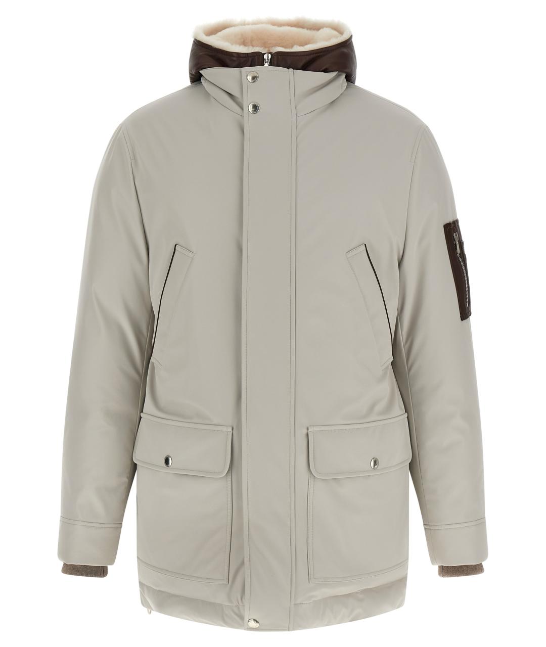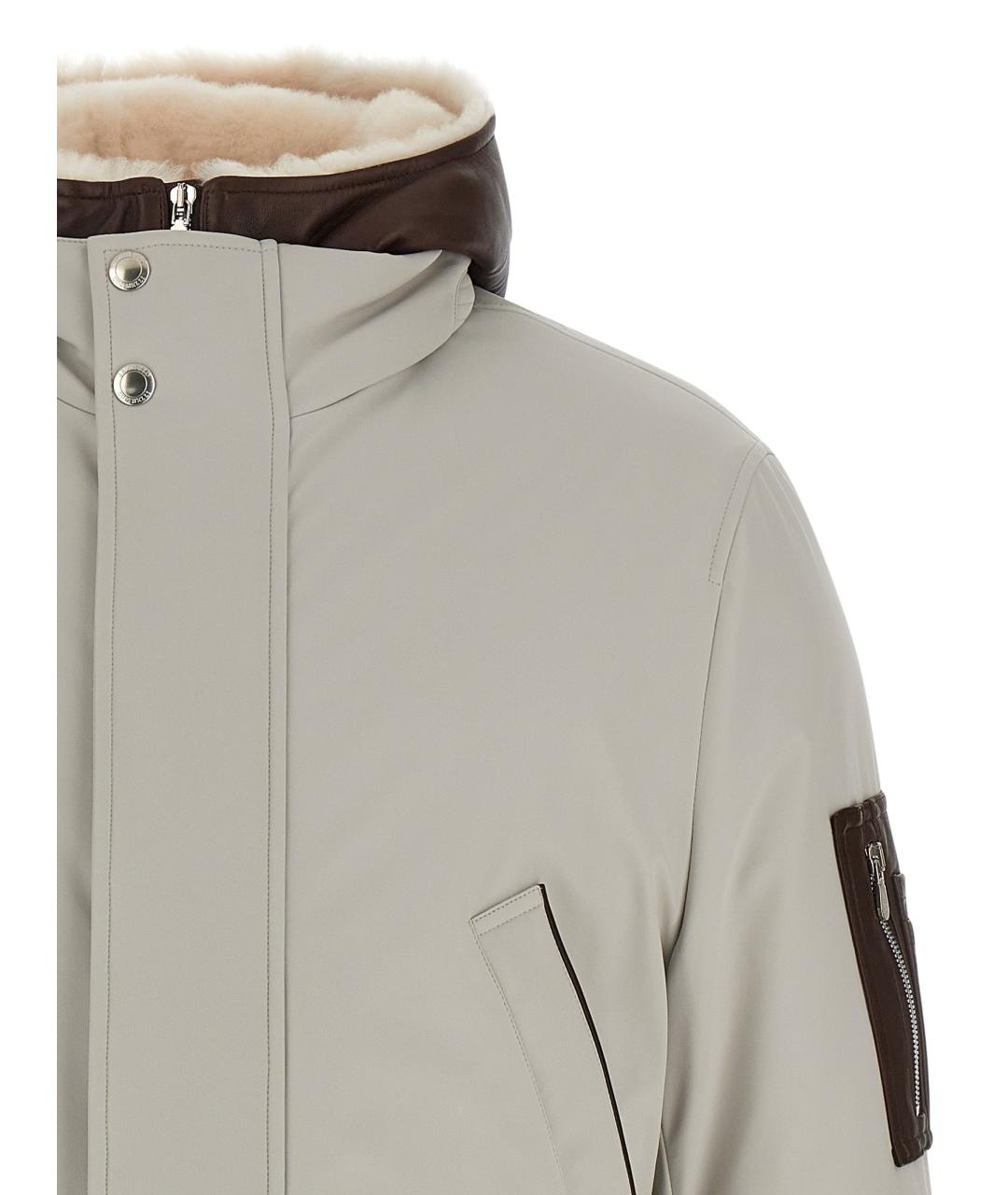 Water-repellent stretch membrane nylon parka, quilted and goose down padded lining, leather harness with hood lined with removable shearling, high neck, front zip and snap button closure, pockets, long sleeves with knitted cuffs, drawstring on the hem, leather details.