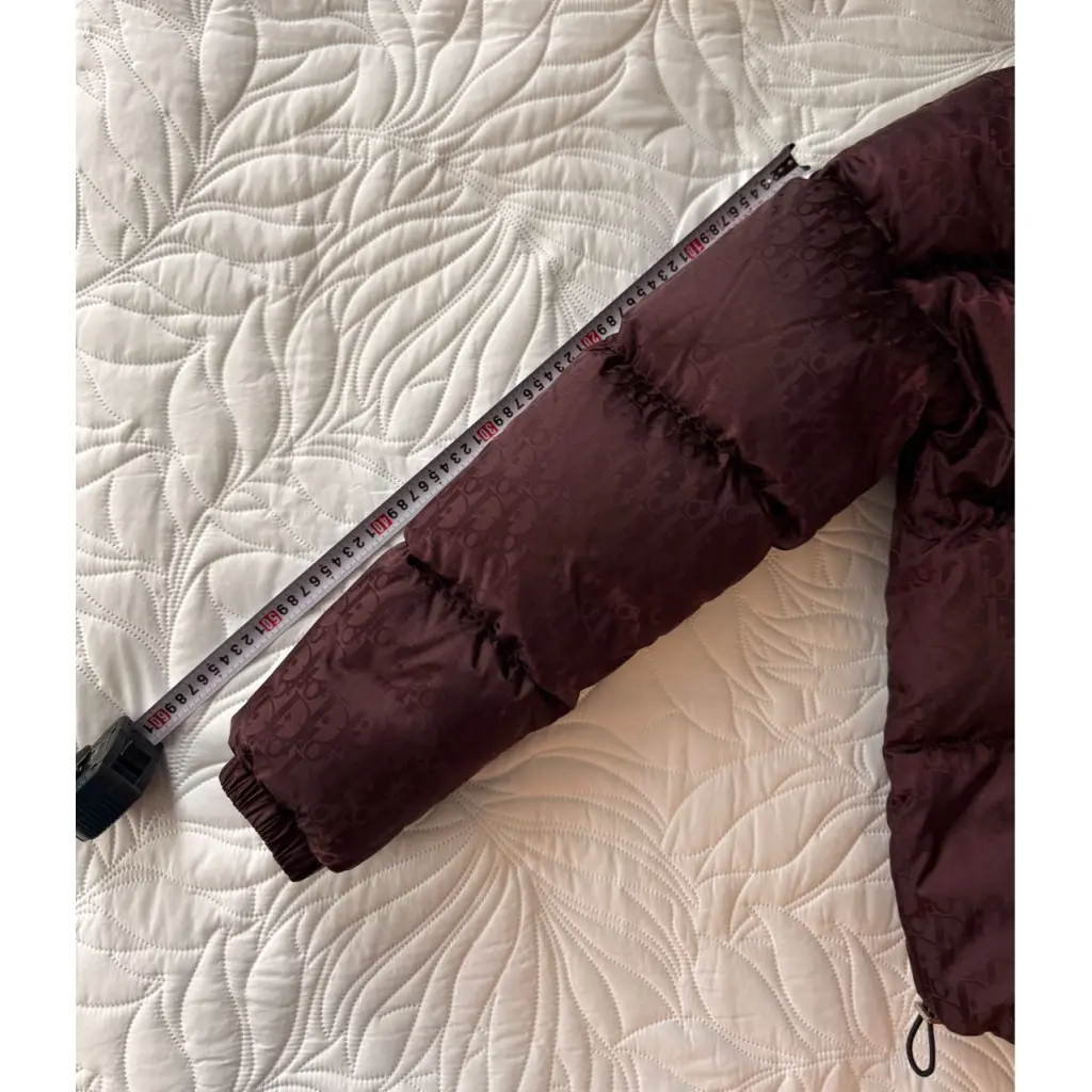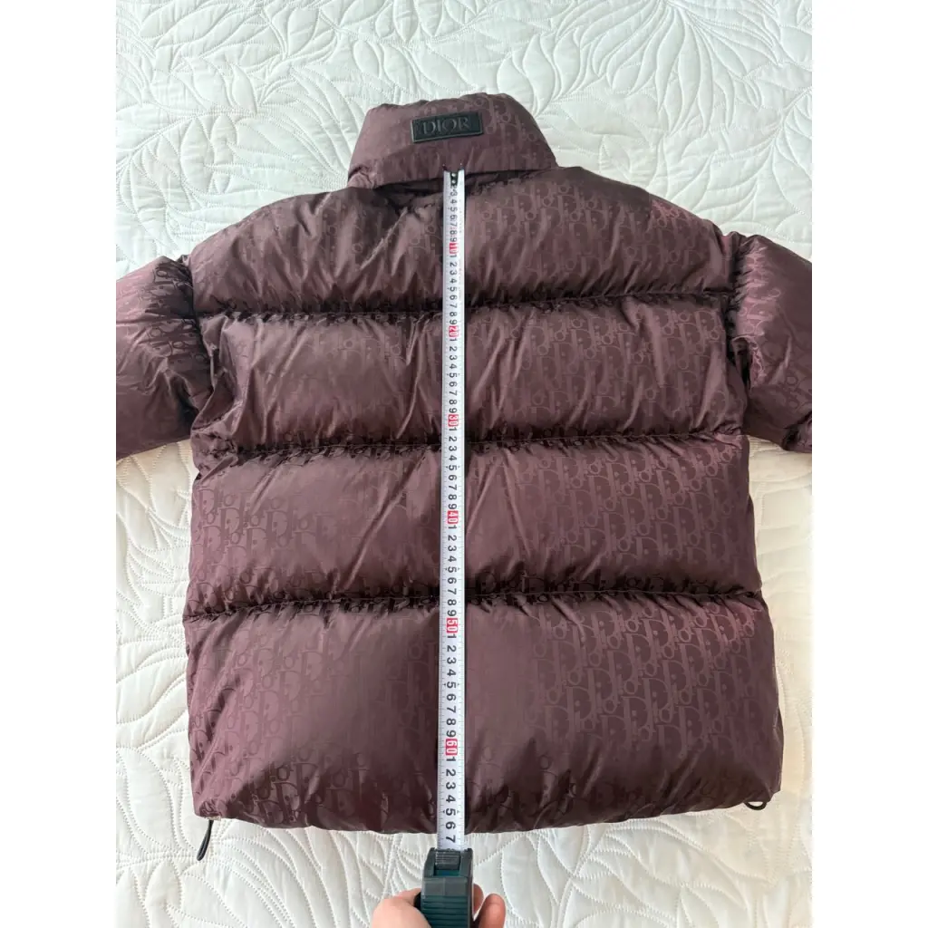 Пуховик DIOR бордового цвета отличается традиционным для модного дома мотивом Dior Oblique в тон.