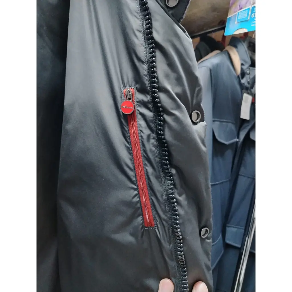 -Модель полуприлегающего кроя с длинными рукавами, прорезными карманами на молниях, высоким воротником-стойкой, съемным капюшоном на кулиске с поперечной ветрозащитной планкой на кнопках, застежкой на молнию и кнопки.