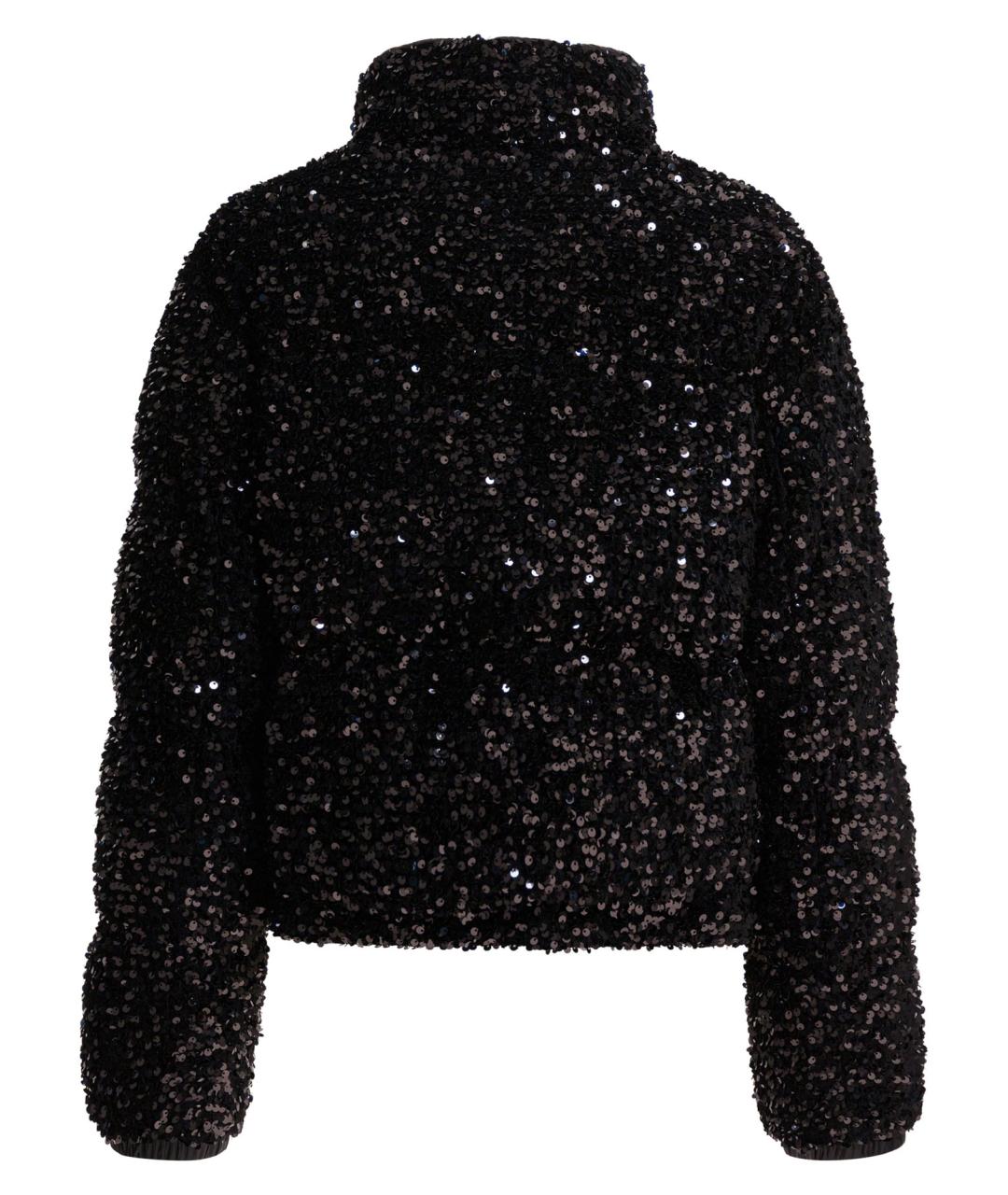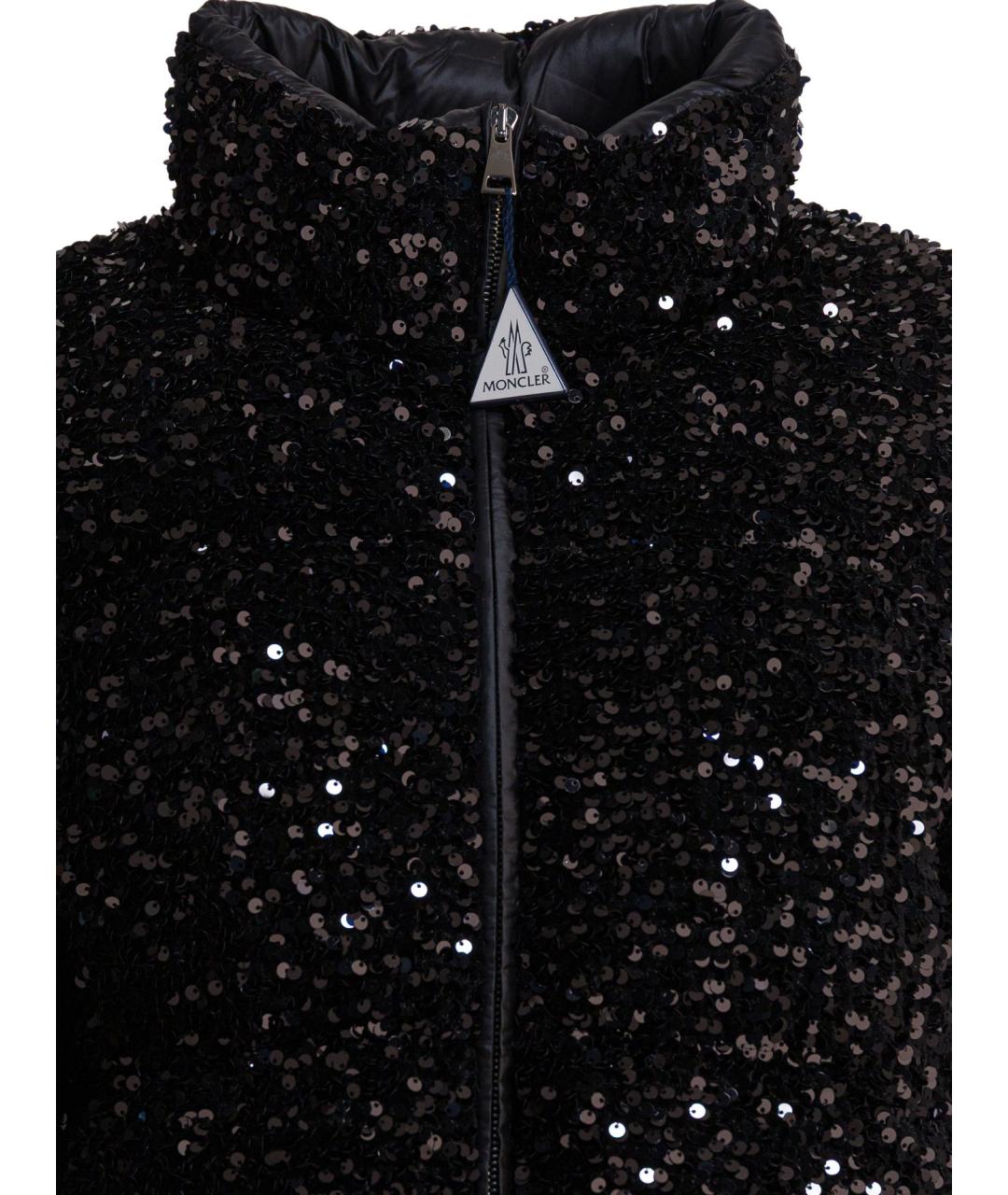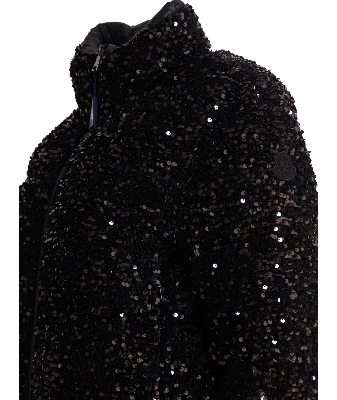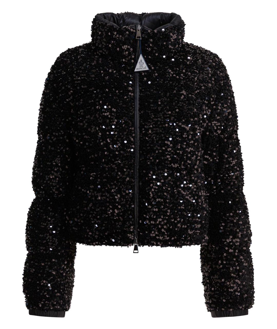Moncler "Louvi" short down jacket, constructed of technical fabric with iridescent sequin embroidery. The padding offers compact structure and strength to the low volume, while the silhouette is short with straight hip progression. Seams are finished to enhance the texture of the fabric, and the regular application of sequins creates an even surface that reflects light. Concealed front closure and slightly raised collar.