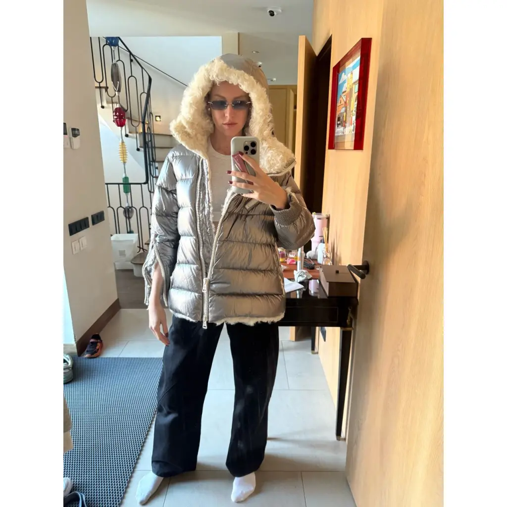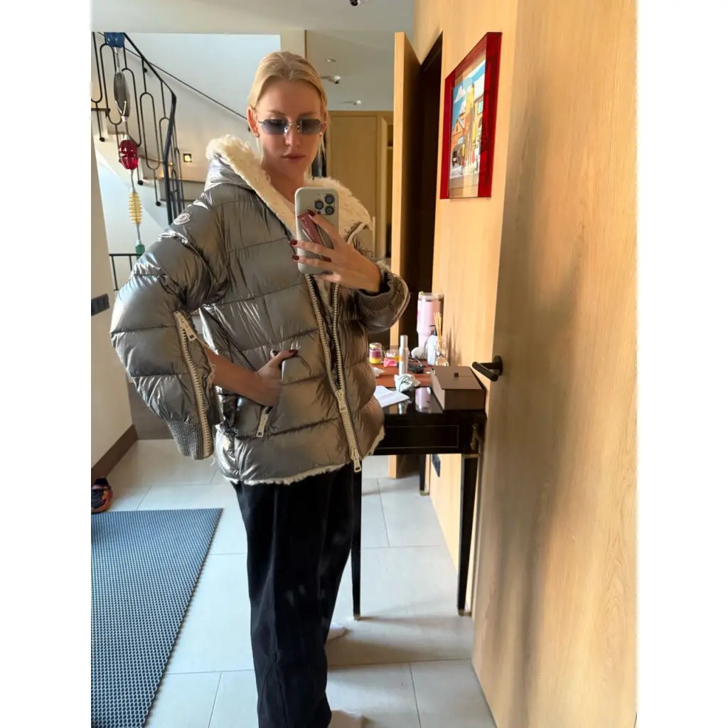 Серебрянный меховой пуховик