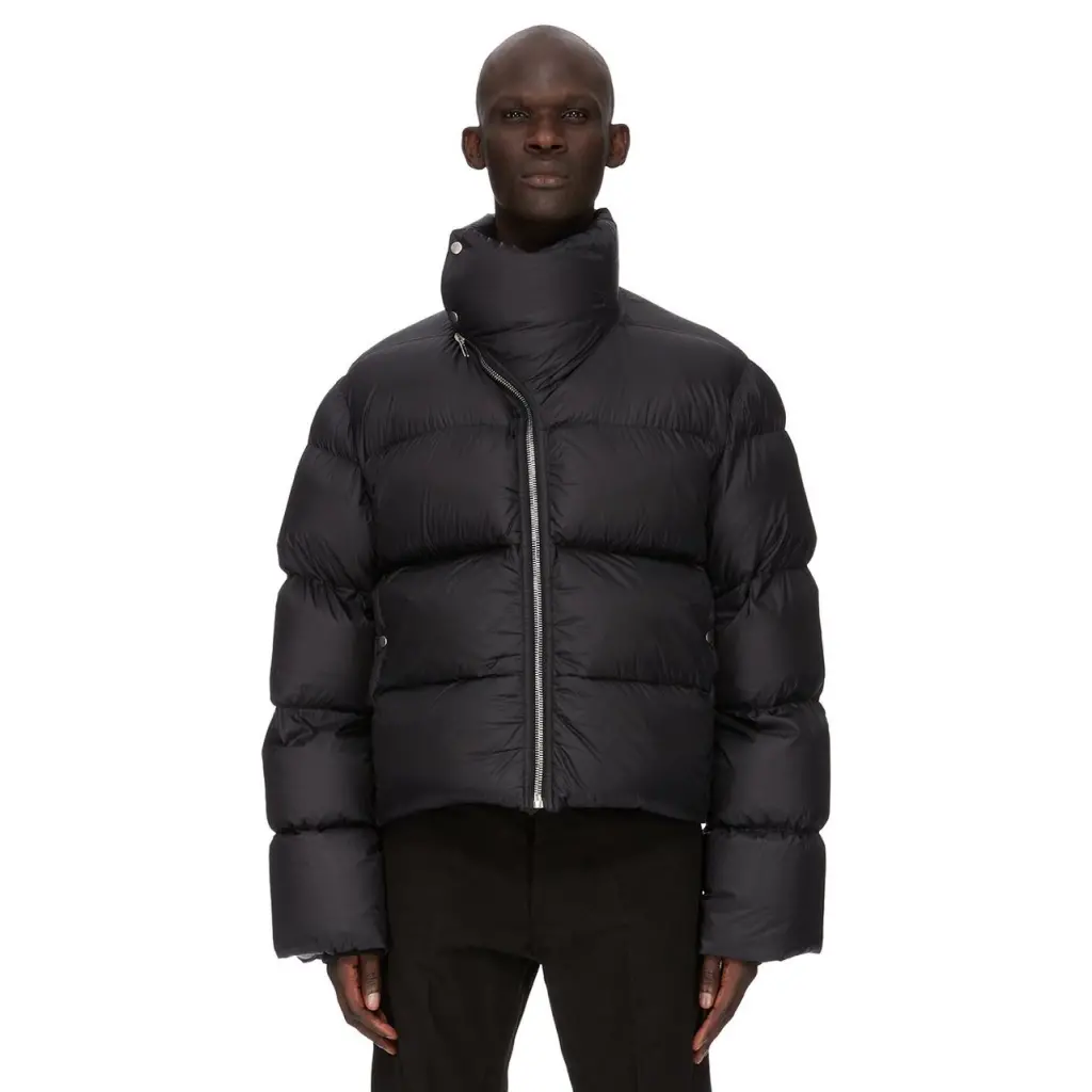 'Turtle' short quilted nylon down jacket with goose down padding, standing collar, asymmetrical front zip closure, pockets, long sleeves with stretch knit cuffs, cotton strap with rivets on the back rack