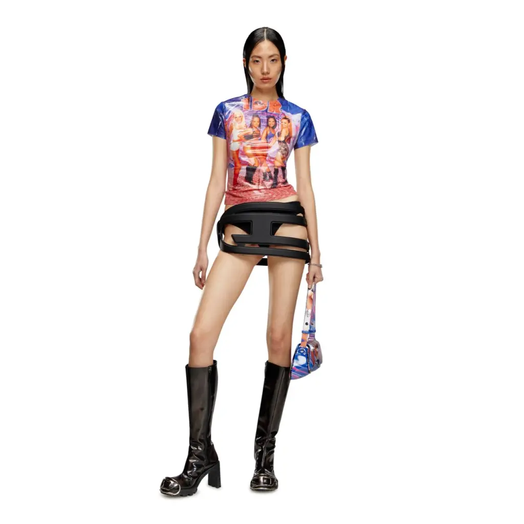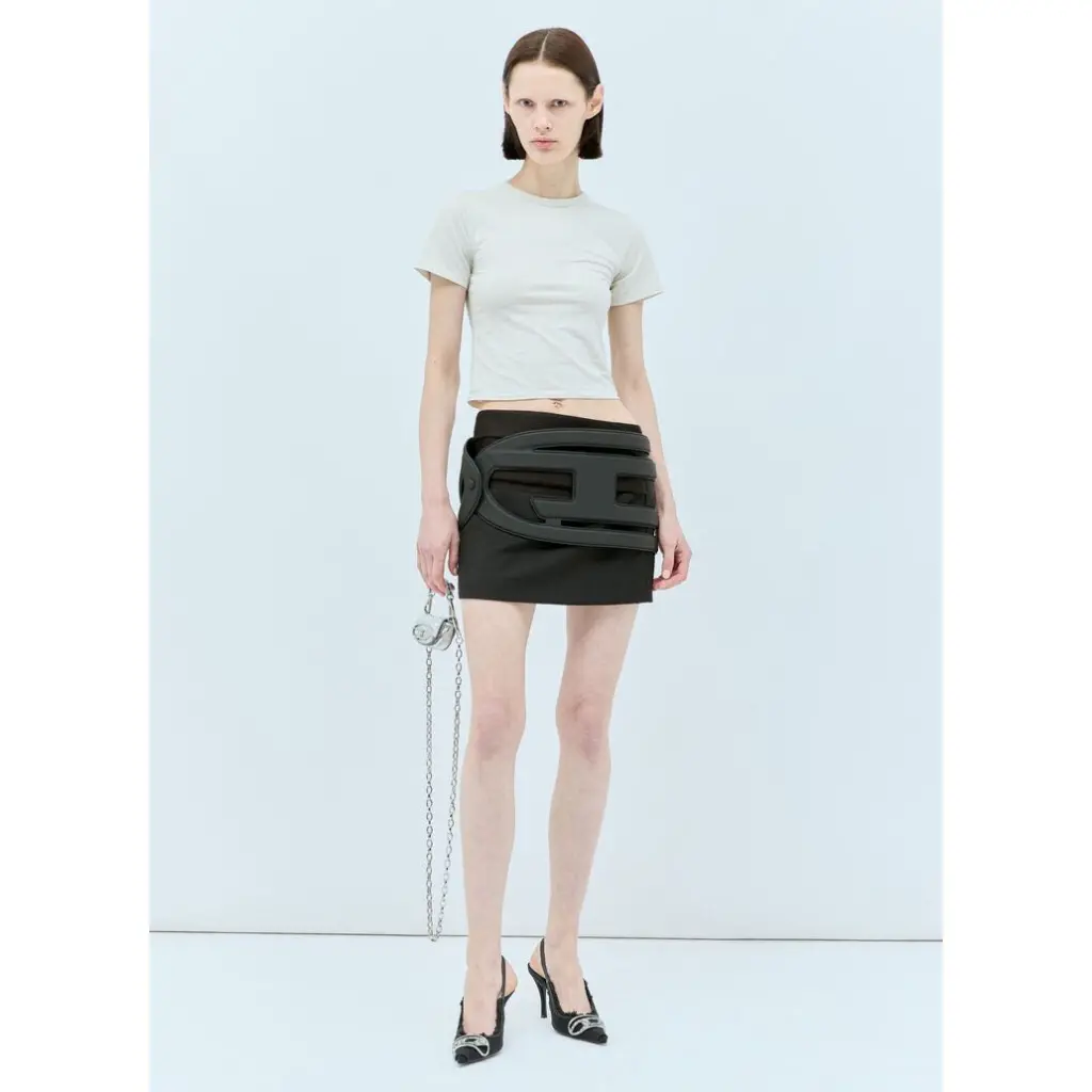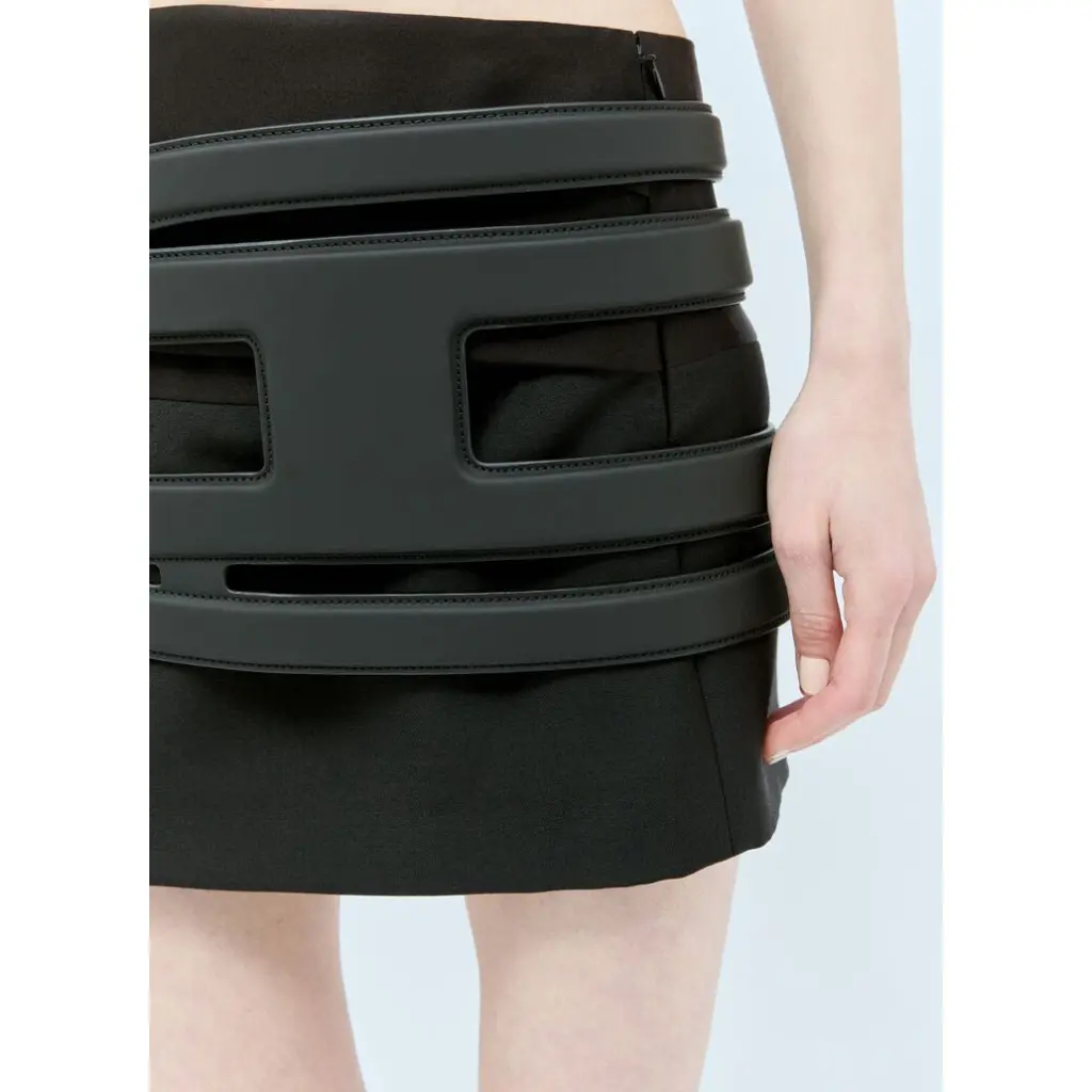 DIESEL belt in black, belt skirt design, polyurethane construction, signature D logo cut-out design, snap-button fastening.