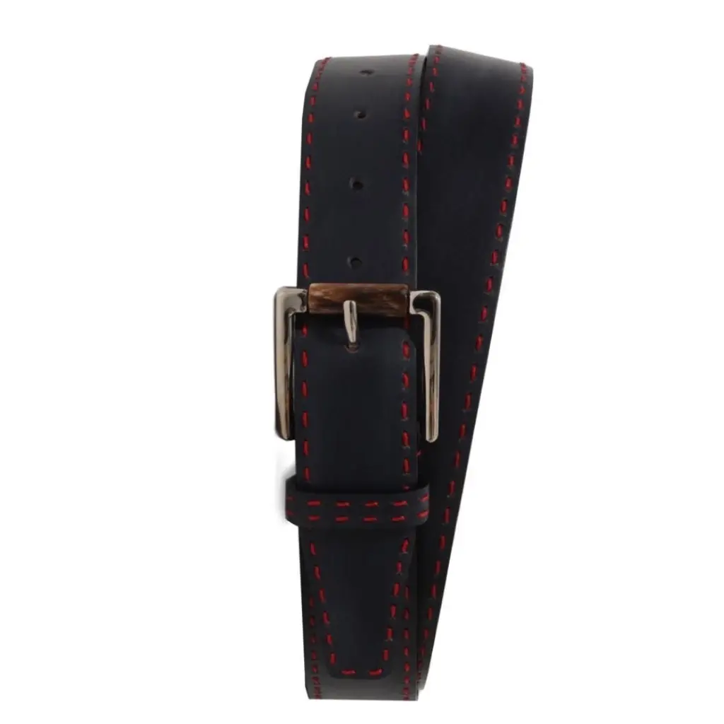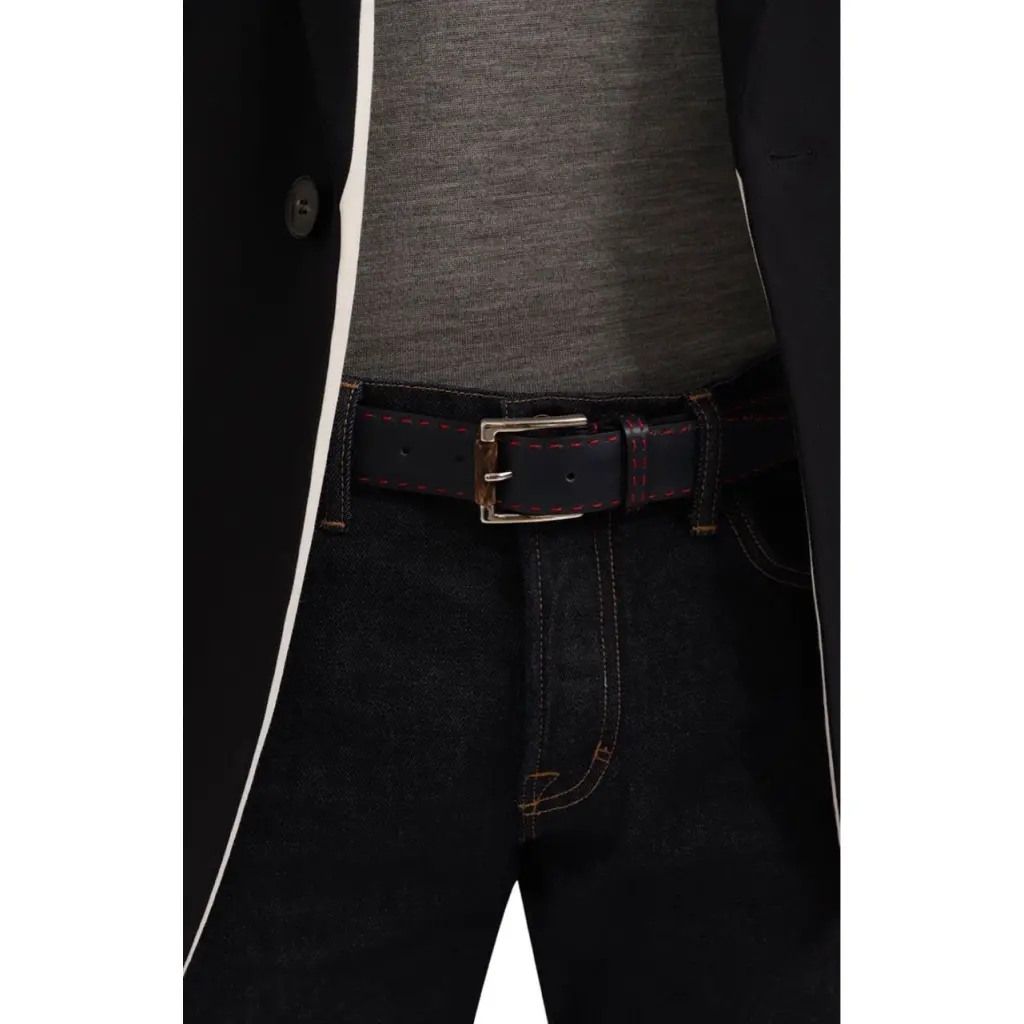 Темно-синий ремень с красными строчками пунто, подчеркивающими края, станет идеальным дополнением джинсов или чиносов. Для создания аксессуара использовали матовую гладкую кожу.