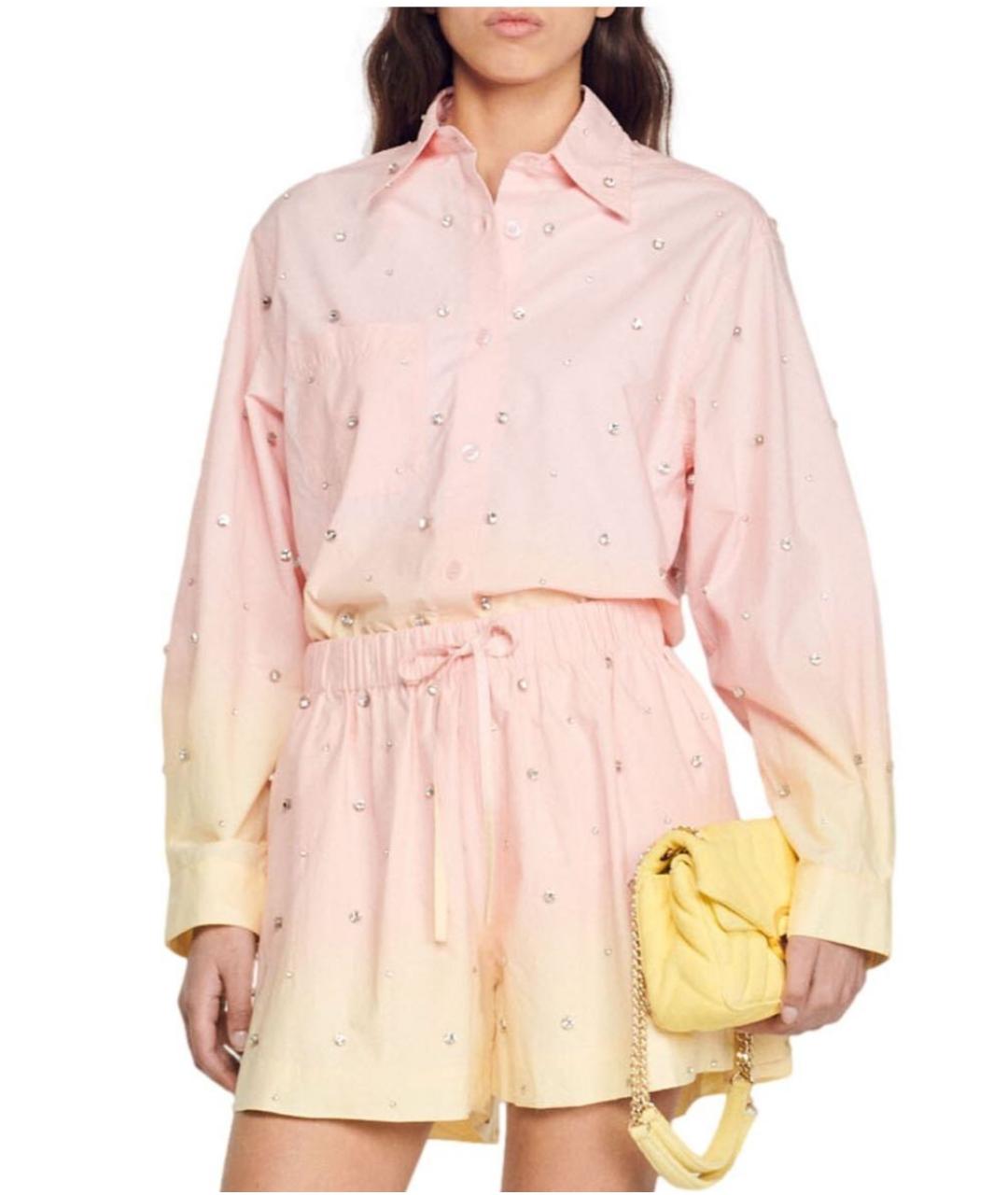 Новая рубашка оверсайз с принтом тай-дай Sandro, разноцветная, розовая, желтая Размер 2 , подойдет 40-46 100% хлопок Стразы: стекло, латунь Имеется небольшой дефект покраски ткани на спине, еле земетен.