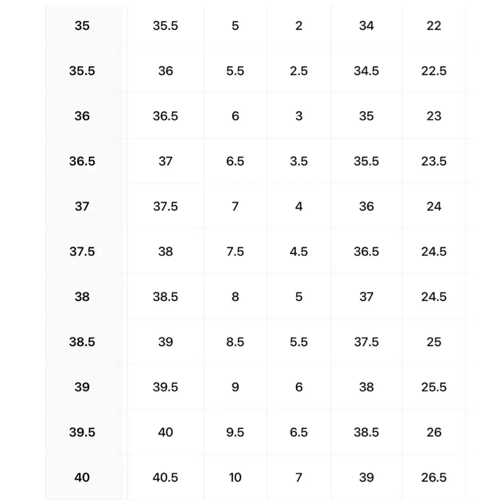 EU 34 34,5 35 35,5 36 36,5 37 37,5 38 38,5 39 39,5 40 40,5 41 41,5 42 42,5 43 Таблица размеров
