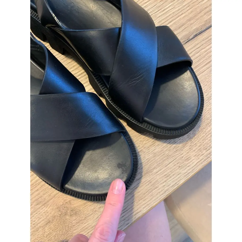 Кожаные сандалии из чёрной кожи в очень хорошем состоянии, из нюансов-разрыв кожи на внутренней стороне ремешка, и в этих же местах небольшое расслоение кожи (см.фото). Размер 41, по стельке -27 см. Очень удобные!