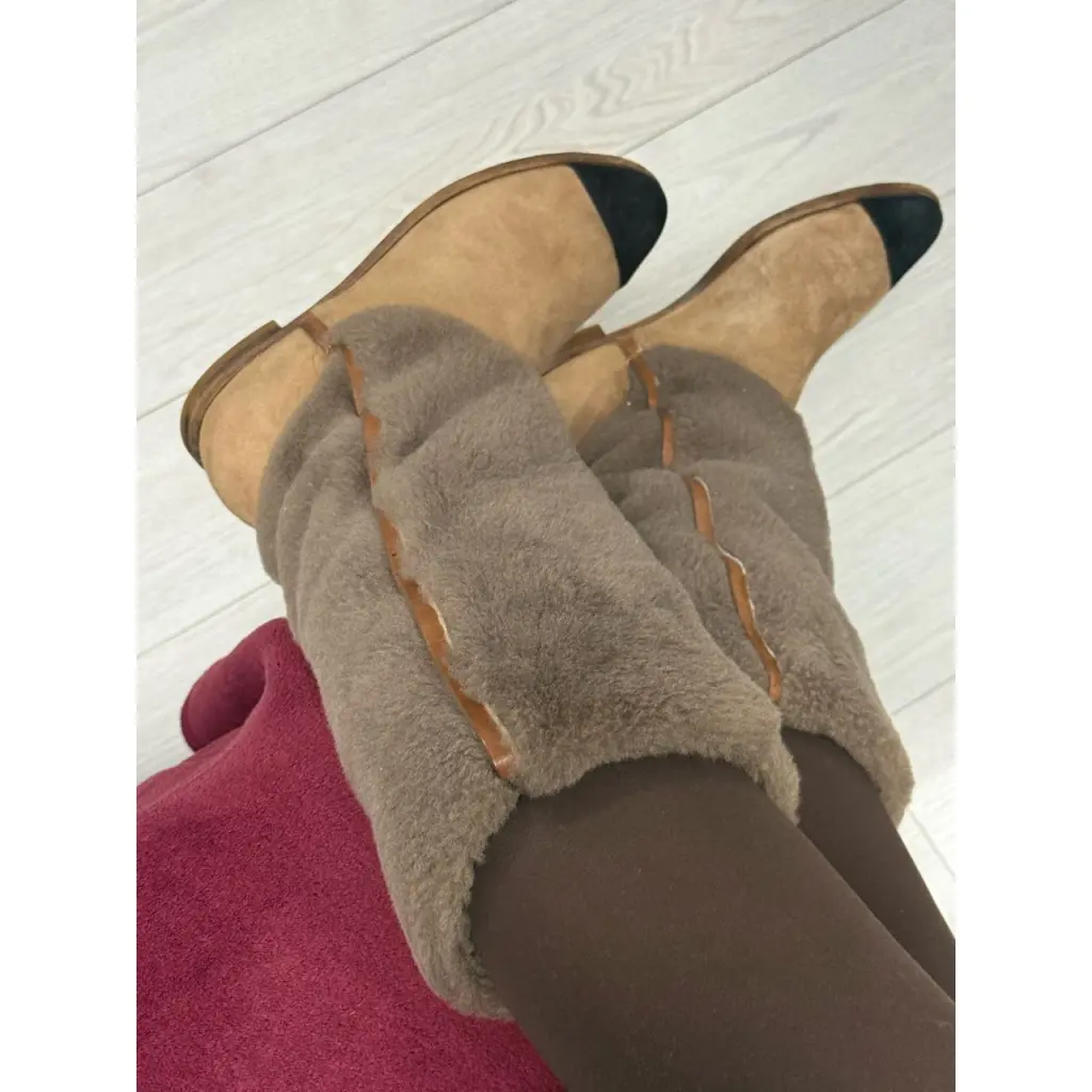 Сапоги в хорошем состоянии, следы носки на подошве и на изделие небольшие. Внутри по голенищу мех, стелька меховая, но из шерсти (тяжело сфотографировать). На носиках логотип, текстура ворсистая у замши.