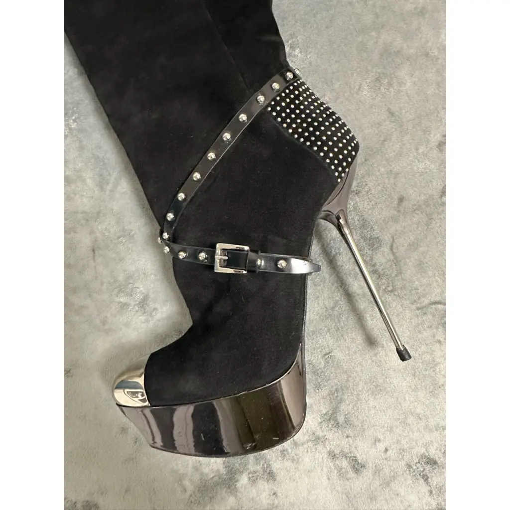 Очень классные, эффектные итальянские сапоги, выполнены из качественной замши. Имеются незначительные следы носки, царапки на подошве и каблуке в металличкой части, в цене учтено. В носке не заметно. Больше фото в комментариях.