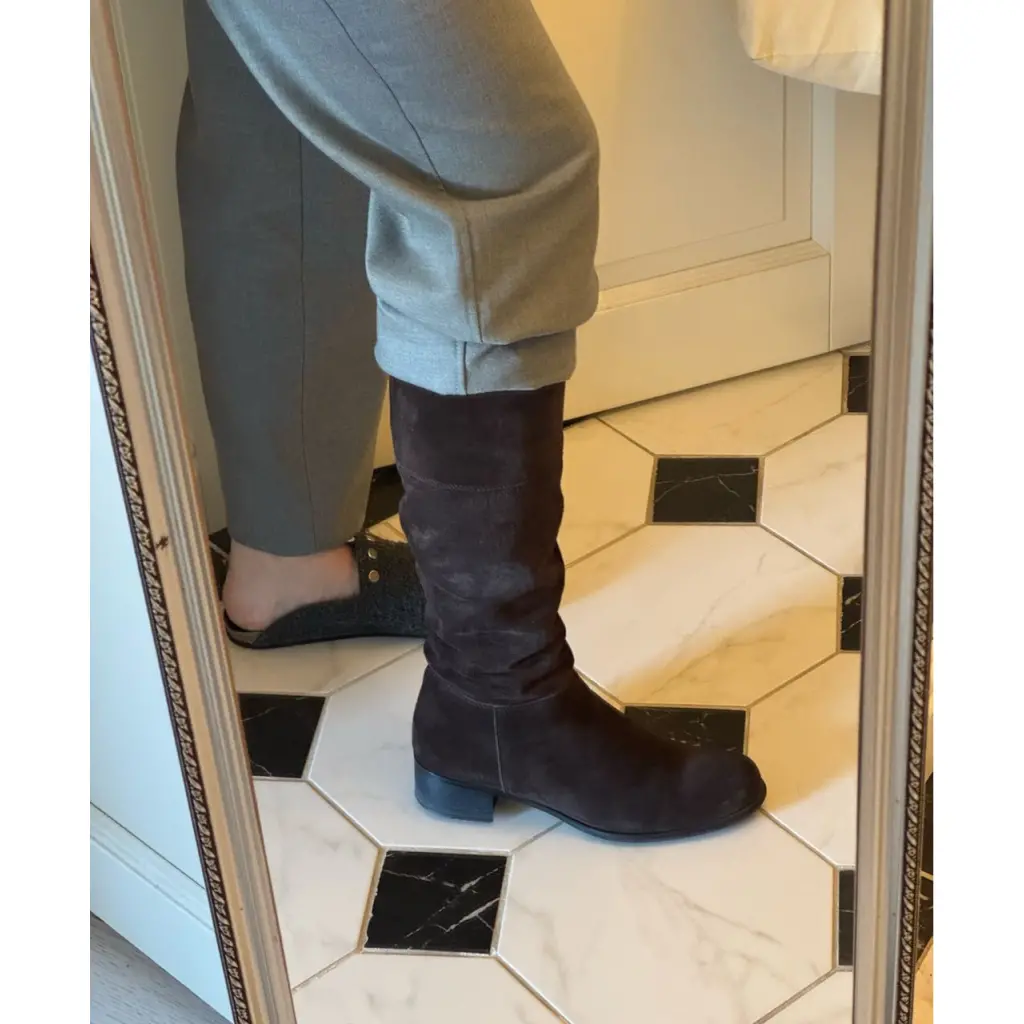 MIU MIU Сапоги Размер 38 Темно-коричневые замшевые сапоги на низком каблуке. Возможны незначительные следы хранения/носки Страна производства — Италия Есть коробка