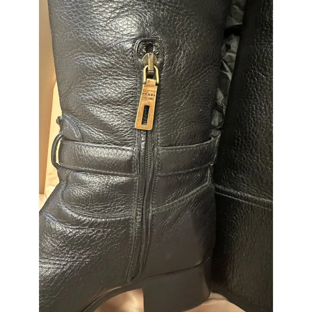 Сапоги изготовлены из высококачественной кожи, имеют форму круглого носка и застежку молнию. Устойчивый каблук средней высоты. Сапоги украшены логотипом Prada золотого цвета.