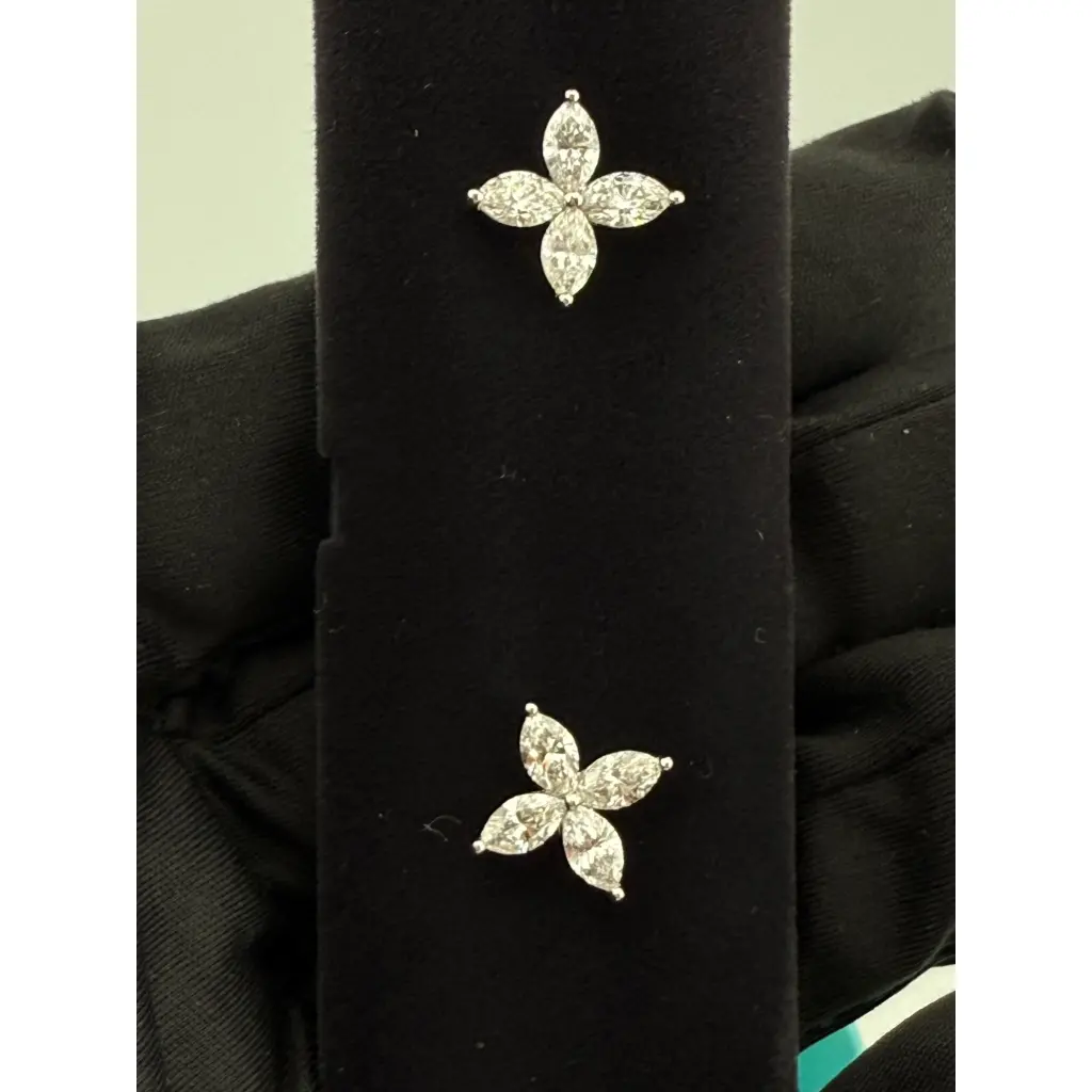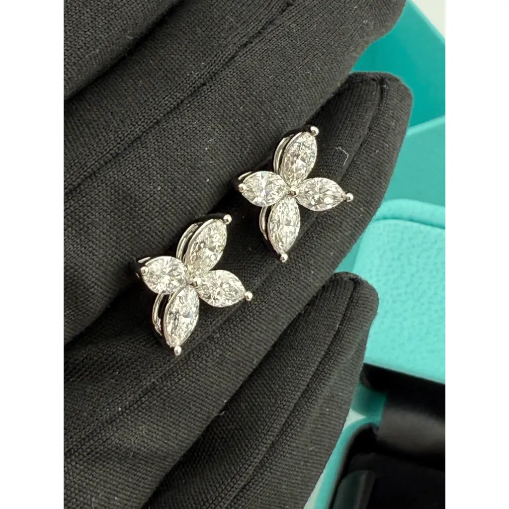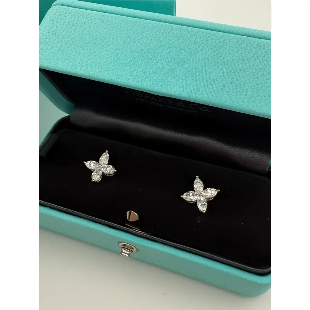 Серьги - пусеты Tiffany & Co коллекции "Victoria" размера LARGE выполненные из платины 950 пробы с бриллиантами формы огранки "Маркиз" общей массой 2,00 ct. чистота VS1. цвет F-G. Размеры: 10,5 мм x 10,5 мм. Вес изделия - 3,36 гр. Модель 2000-2009 гг. В комплекте коробка. Документы не сохранились.