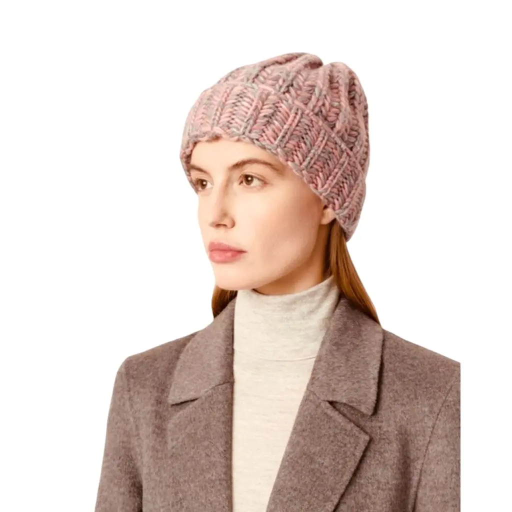 Розовая облегающая шапка с широким отворотом связана вручную из меланжевой шерсти мериноса.