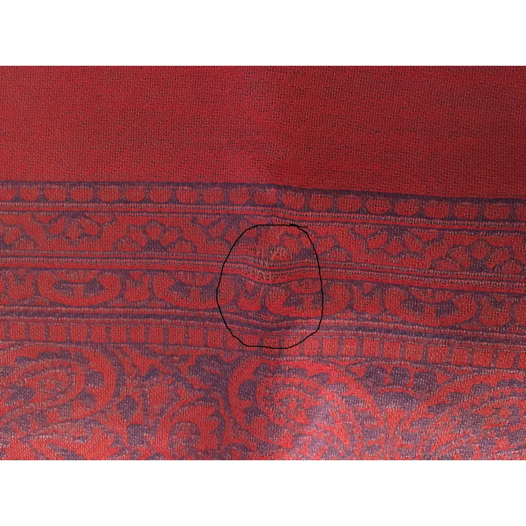 77% хлопка и 23% шелка. Размер 71*188см. Двусторонний кораллово-красный и фиолетово-розовый. В одном месте (круглое пятнышко р-ром 2см) есть перемещение ниток.