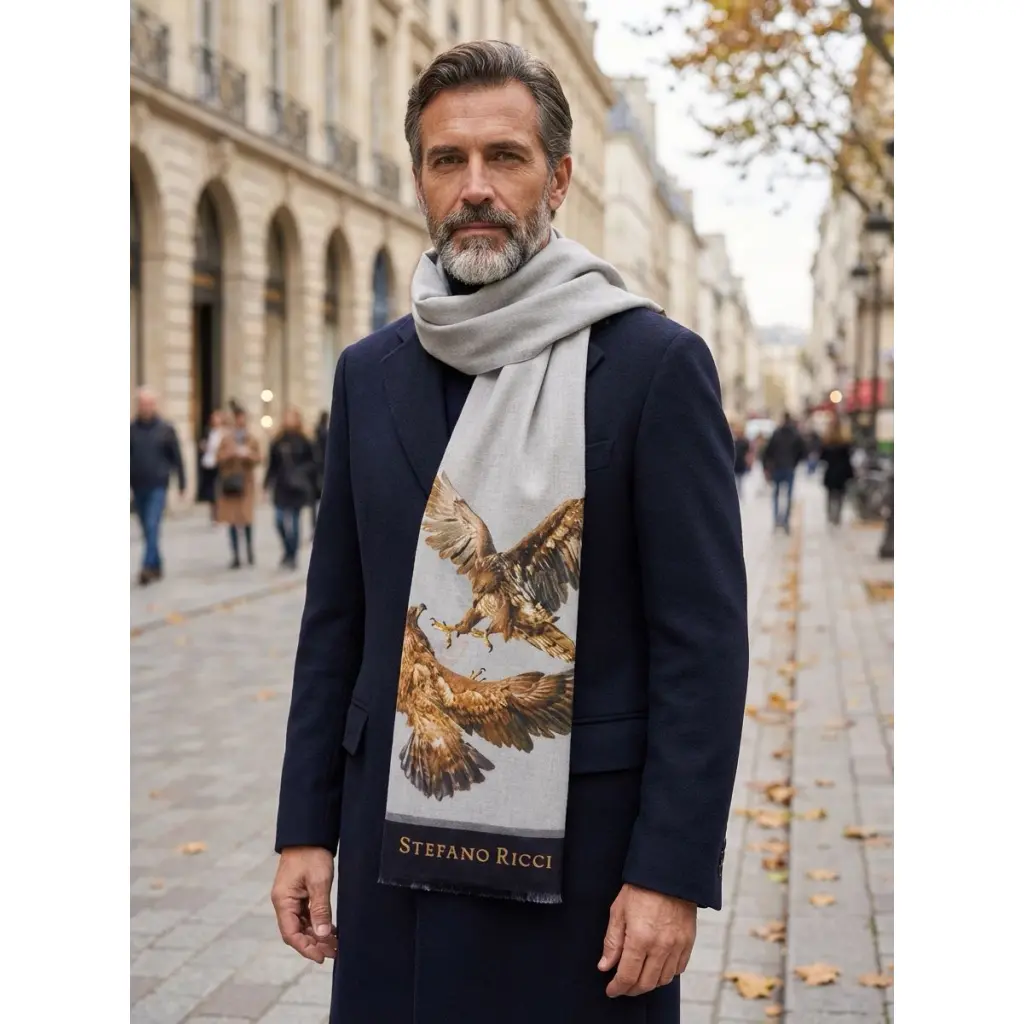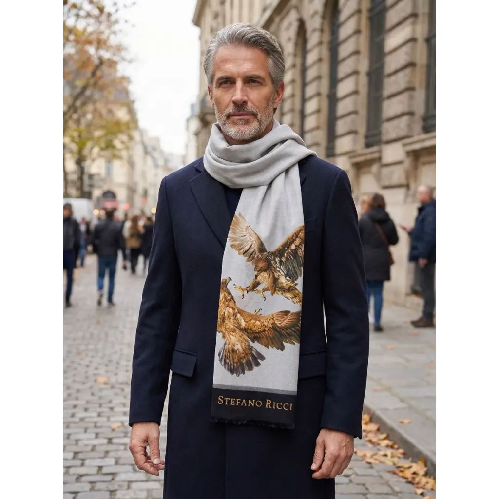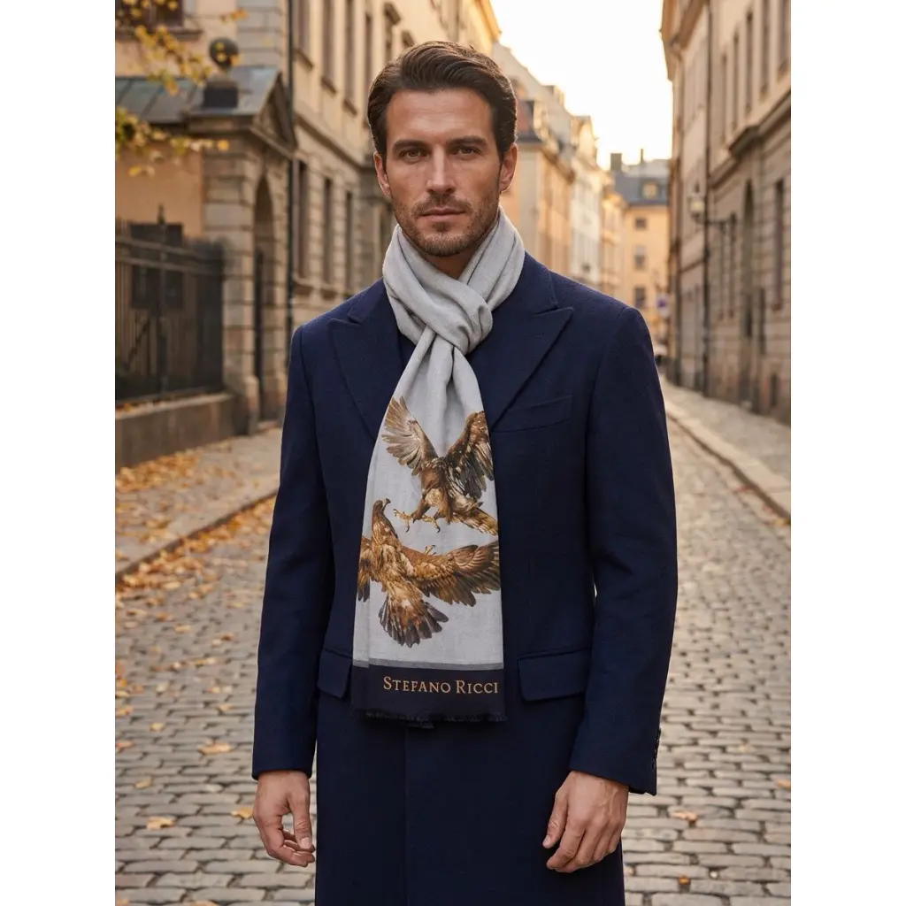 Для изготовления длинного серого шарфа с короткой бахромой по краям использовали тонкий нежный кашемир. Материал с шелковистыми волокнами поддерживает оптимальную температуру, согревая в морозную погоду и не допуская перегрева во время оттепели. Аксессуар декорировали крупным принтом в виде парящих орлов и логотипом на широком канте