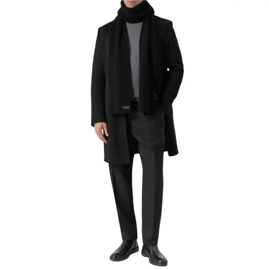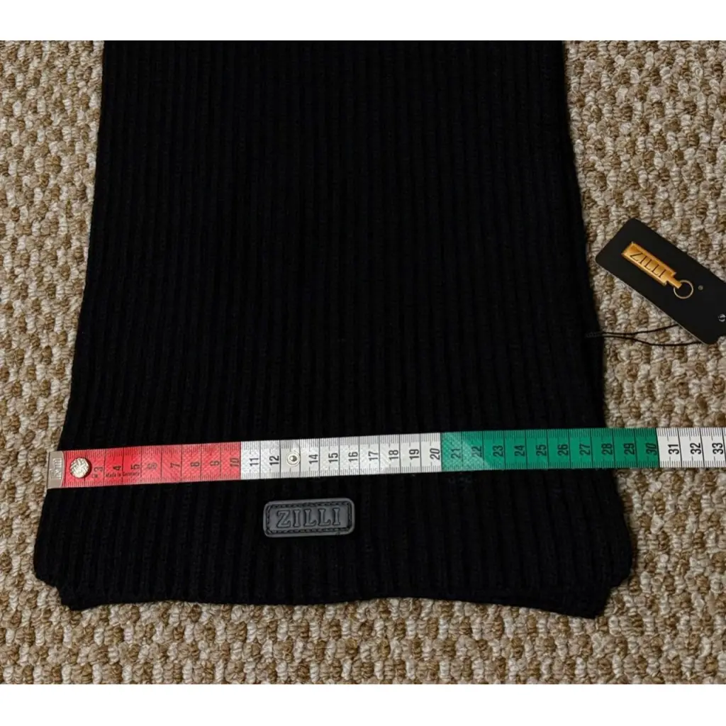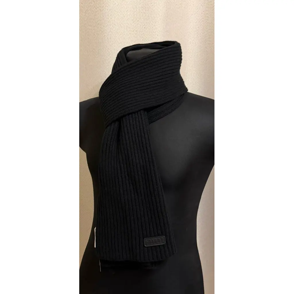 Черный шарф связали рифленым эластичным узором из тонкой мягкой шерсти премиального качества. Чтобы сделать модель легче, еще теплее и приятнее на ощупь, в пряжу добавили нежнейший кашемир. Длины аксессуара, декорированного миниатюрным кожаным патчем с тисненым логотипом, хватит, чтобы несколько раз обернуть вокруг шеи или завязать французский узел