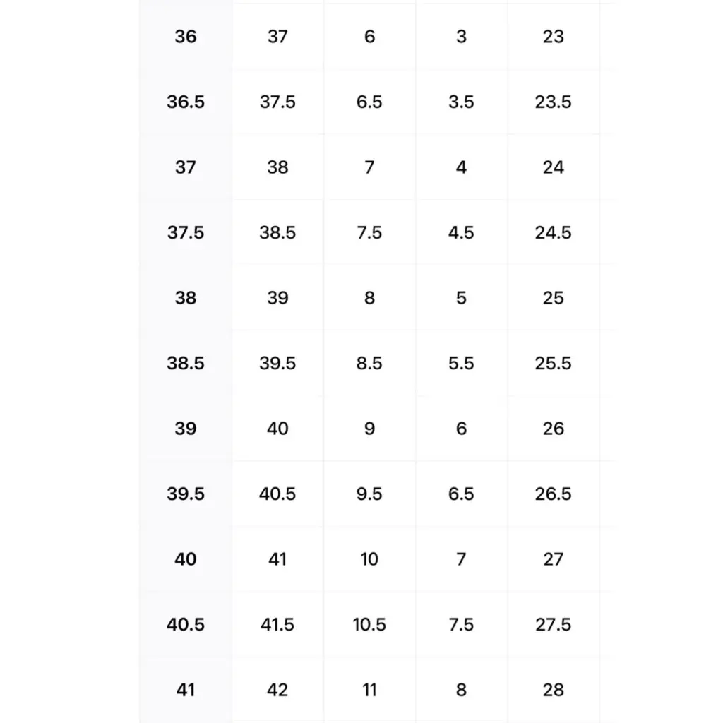 EU 34 34,5 35 35,5 36 36,5 37 37,5 38 38,5 39 39,5 40 40,5 41 41,5 42 42,5 43 Таблица размеров