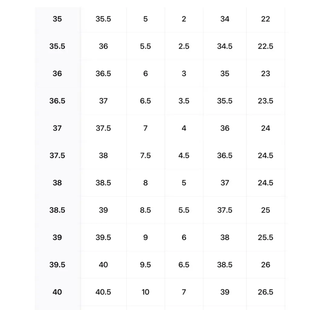 EU 34 34,5 35 35,5 36 36,5 37 37,5 38 38,5 39 39,5 40 40,5 41 41,5 42 42,5 43 Таблица размеров