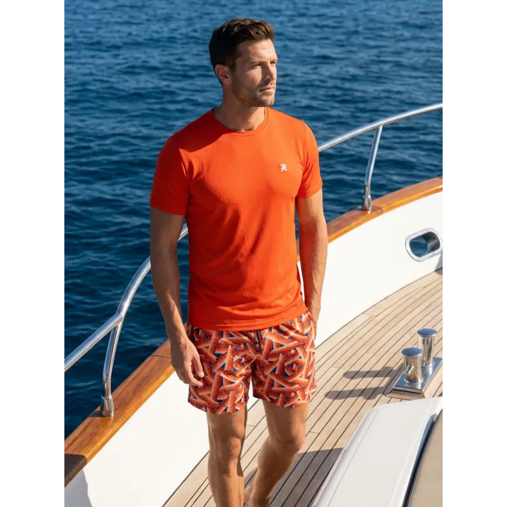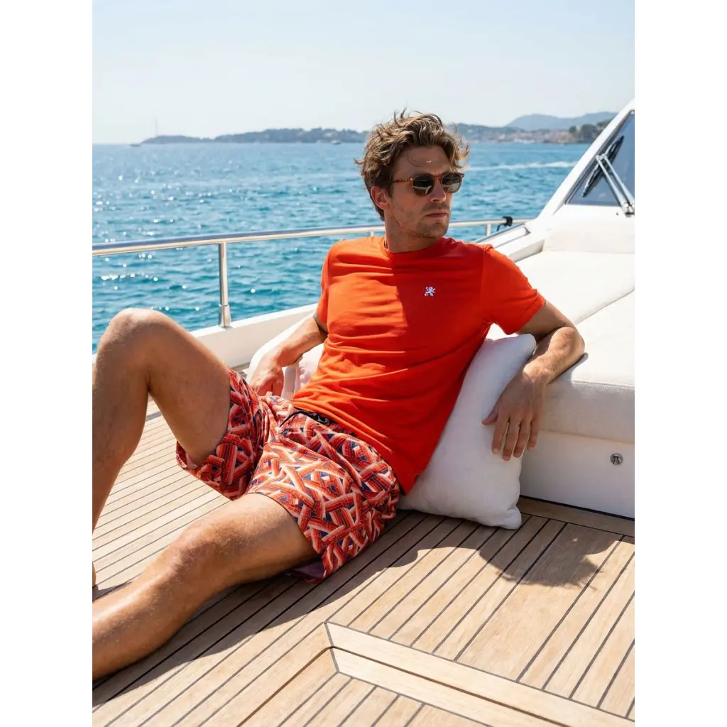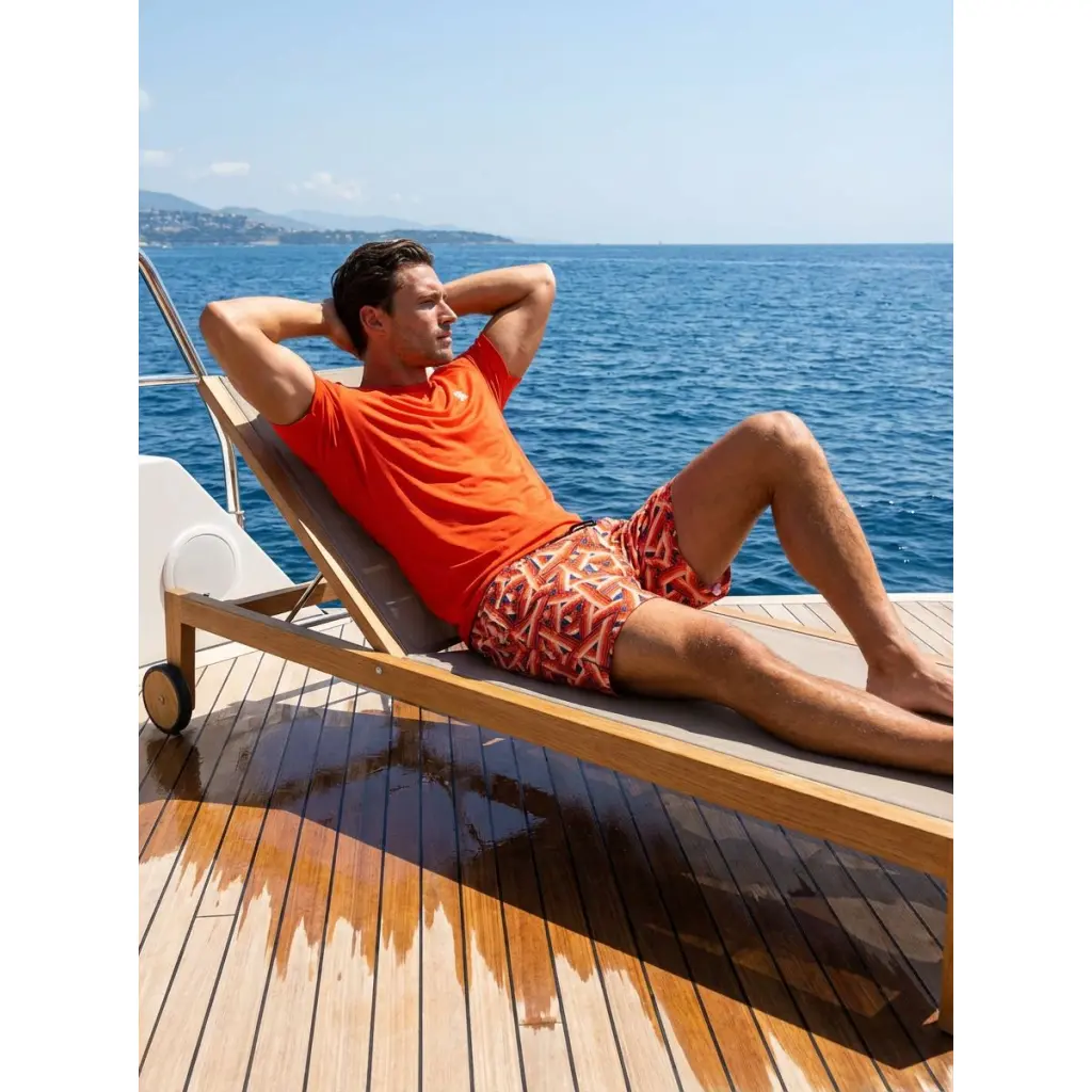 Плавки с геометрическим принтом, в котором зашифровано название марки, сшили из прочного легкого полиамида.