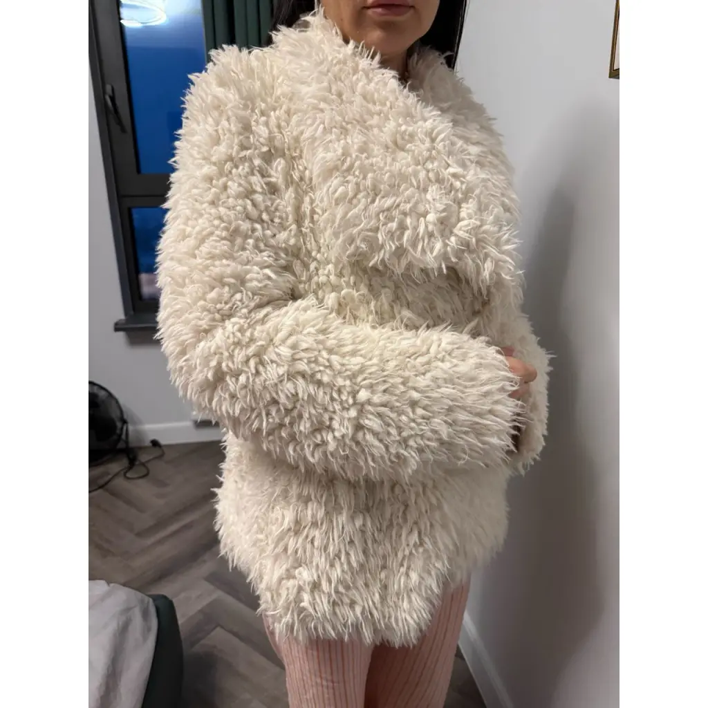 Искусственный мех, без пуговиц и молний, легкая, мягкая на ощупь, красивая, не для морозов, можно носить в холодную осень, и до -15 думаю)