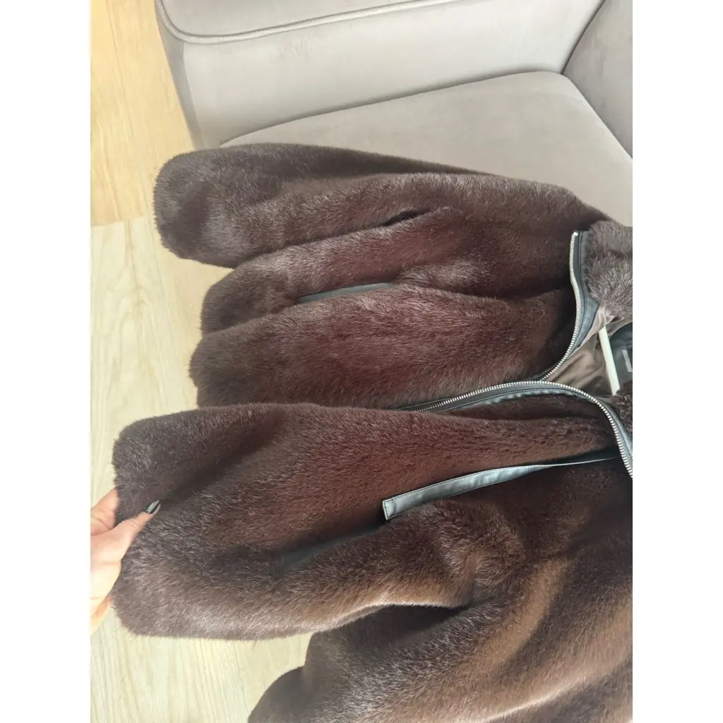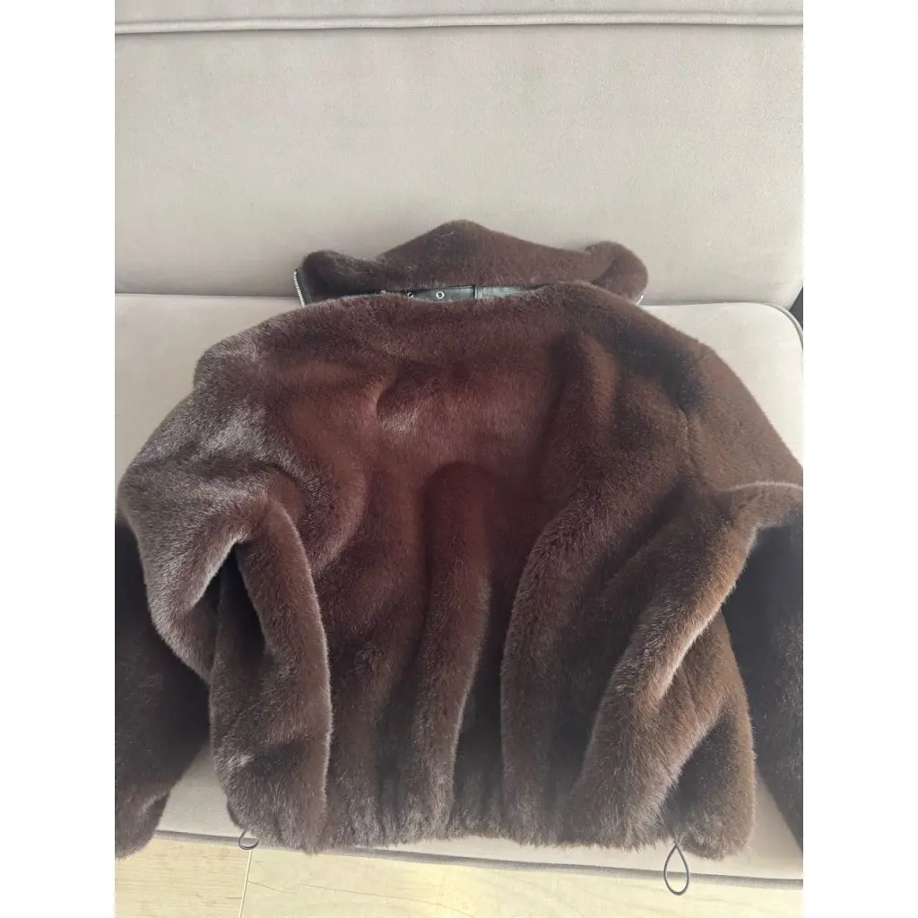 Куртка выполнена из искусственного меха. Застежка на молнии, два боковых кармана. Воротник стойка. В наличии в России. Есть следы носки на внутренней части рукавов и нижней части