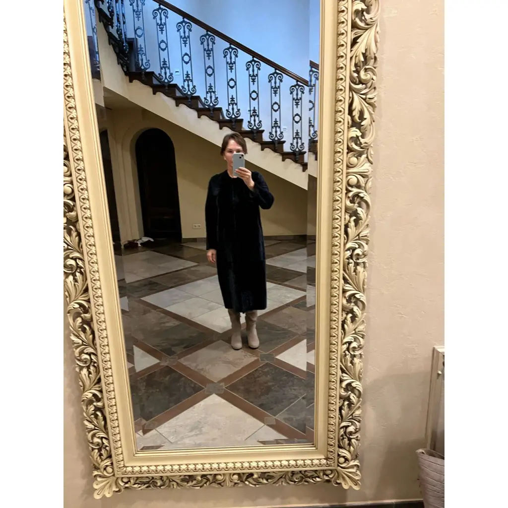 Шубка из шелковистой овчины темно-синего цвета на кнопках,с карманами,длина миди. Длина рукава от воротника 71, ширина на уровне подмышек 47,длина 114. Фирменный чехол. Носилась аккуратно и немного, состояние отличное,я не эксперт,под микроскопом вещь не рассматриваю,поэтому могу что-то не увидеть. Нашла небольшую потертость внутри на уровне между второй и третьей кнопкой.(фото)