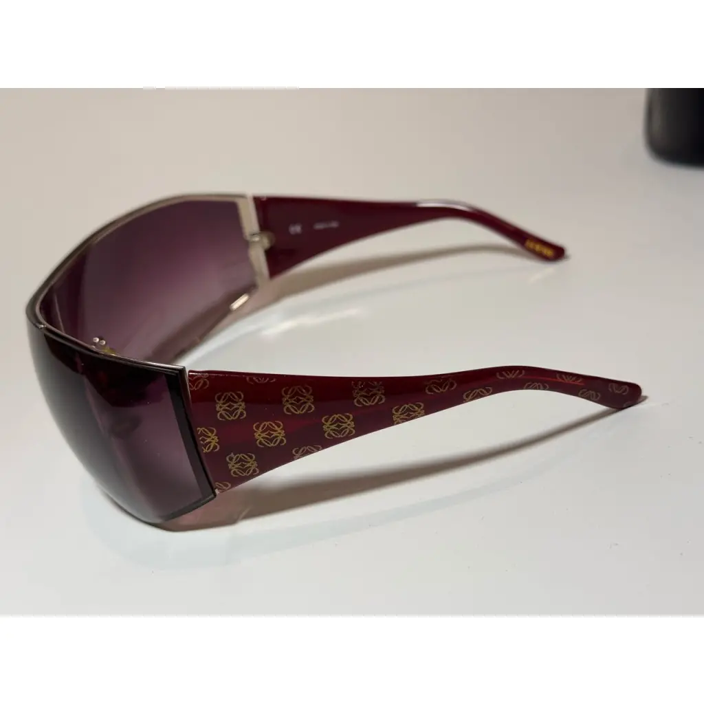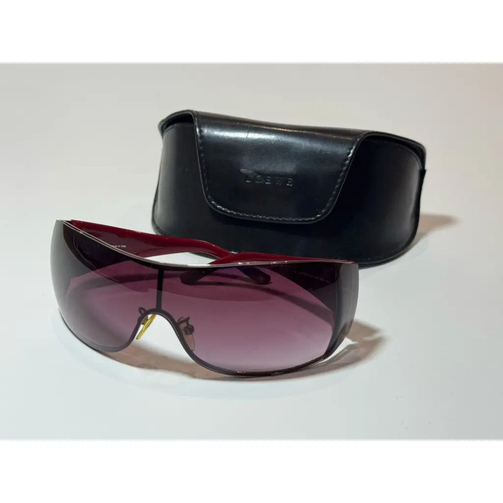 В продаже солнцезащитные очки-маска Loewe Оригинал, винтаж - примерно 2015 г Чехол в комплекте Цвет: бордовый Нюанс: небольшие потертости на линзе; незначительные потертости на дужках; незначительные потертости на чехле