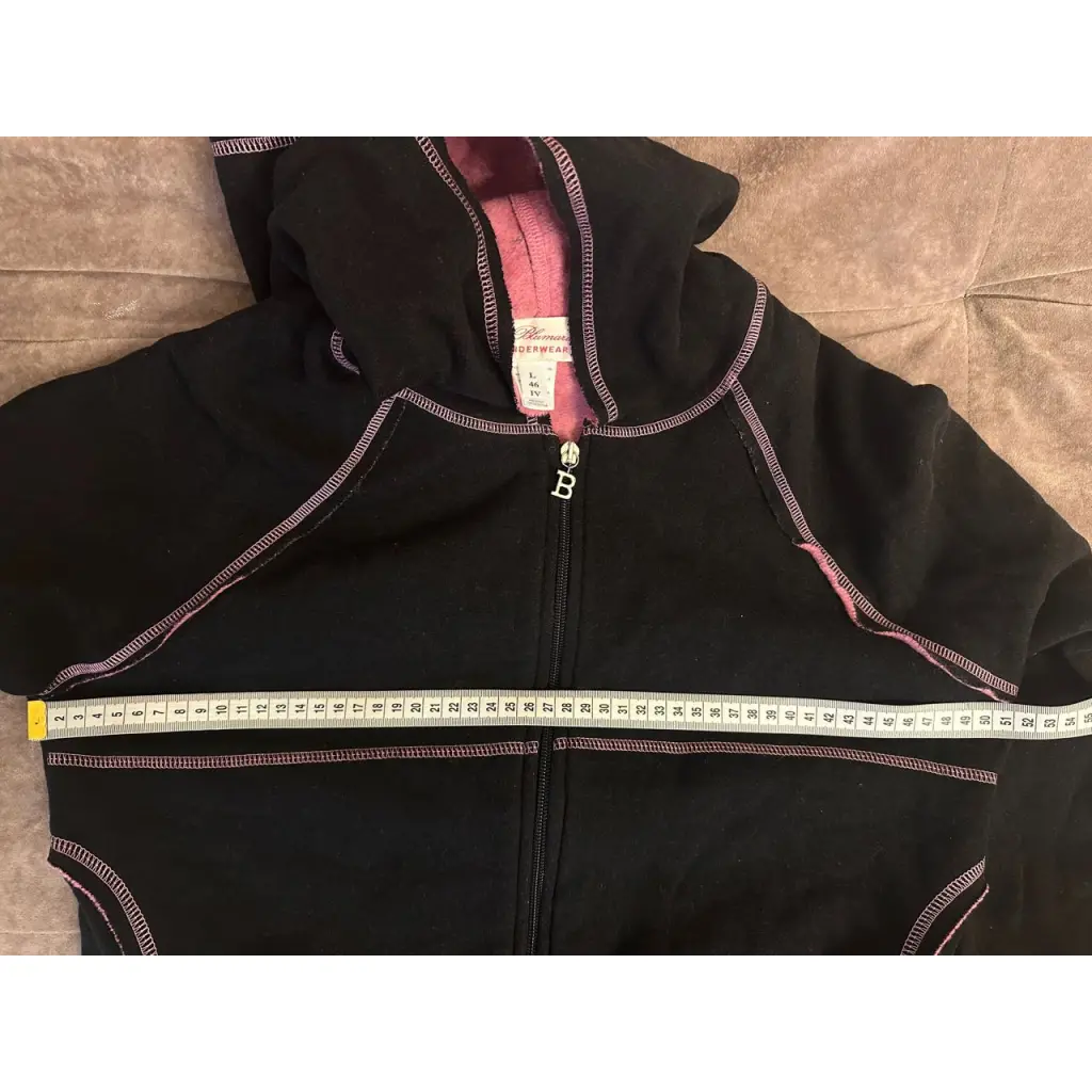 Спортивная кофта на молнии с глубоким капюшоном. Цвет чёрный, подклад и швы розовые. Декорирована имитацией необработанного шва и фирменной надписью из клёпок на спине . Можно носить в качестве домашней одежды, заниматься спортом и просто гулять.