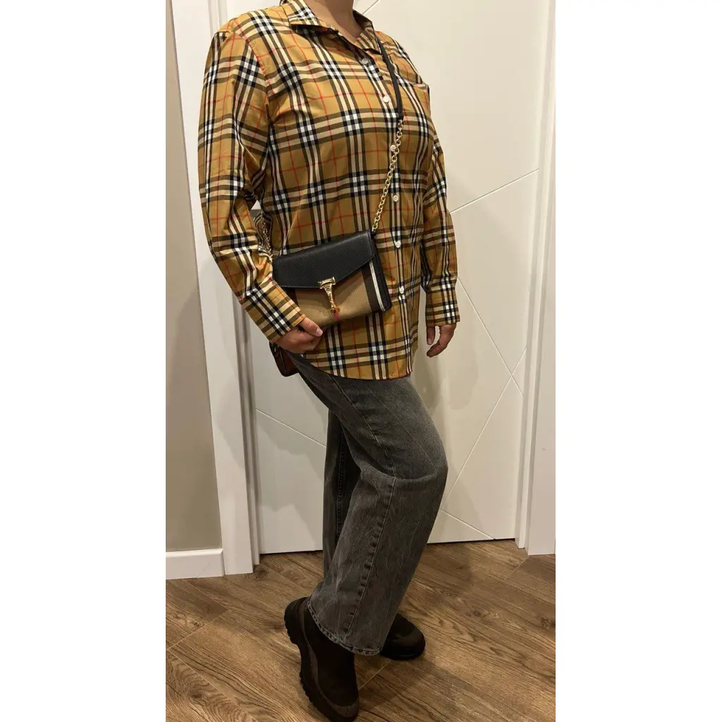 Сумка кросс-боди Burberry Macken из зернистой кожи черного цвета с клетчатой вставкой из хлопкового текстиля. Фурнитура золотистая, замок выполнен в форме карабина, регулируемый плечевой ремень, внутри 2 отделения, наружный задний карман на молнии. Размеры 19 х 13 х 4 см.